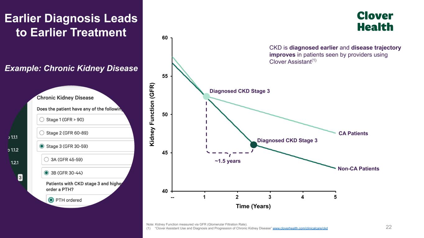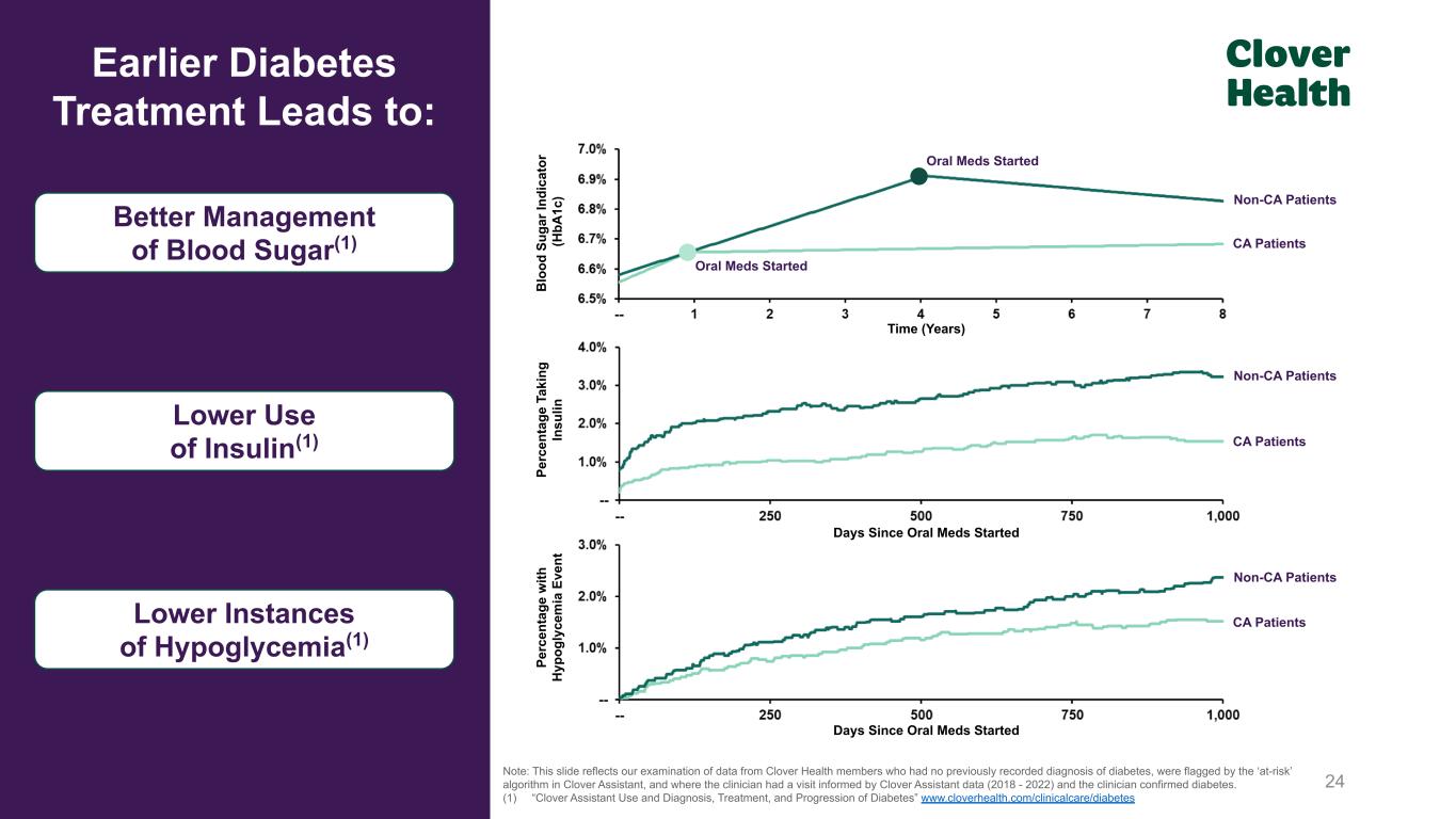 23 Note: This slide reflects our examination of data from Clover Health members who had no previously recorded diagnosis of diabetes, were flagged by the ‘at-risk’ algorithm in Clover Assistant, and where the clinician had a visit informed by Clover Assistant data (2018 - 2022) and the clinician confirmed diabetes. (1) Represents percentage (%) of pre-existing diagnoses similar in the two groups. (2) “Clover Assistant Use and Diagnosis, Treatment, and Progression of Diabetes” www.cloverhealth.com/clinicalcare/diabetes Days Since Clover Assistant Visit M em be rs N ew ly D ia gn os ed w ith D ia be te s (1 ) Earlier Diagnosis Leads to Earlier Treatment Example: Diabetes Patients started on oral diabetic medications after Clover Assistant raised potential diabetes diagnosis for physician consideration(2) D ia be te s M ed ic at io n Fi lls