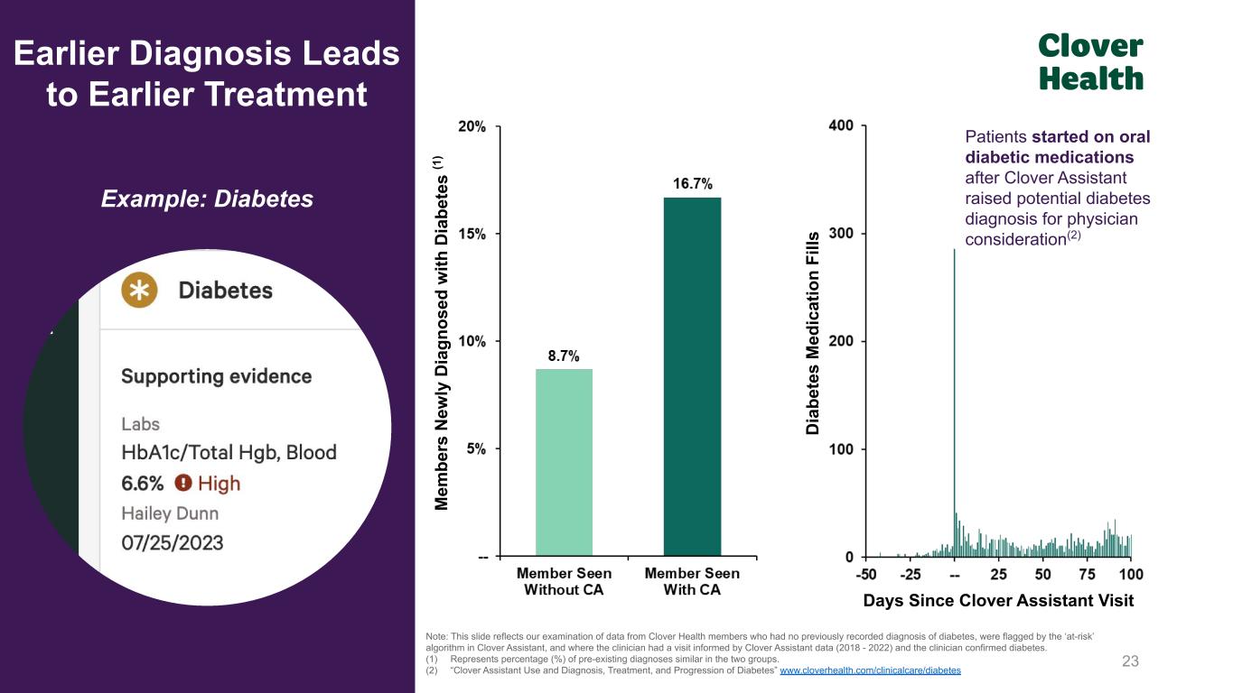 22Note: Kidney Function measured via GFR (Glomerular Filtration Rate). (1) “Clover Assistant Use and Diagnosis and Progression of Chronic Kidney Disease” www.cloverhealth.com/clinicalcare/ckd Earlier Diagnosis Leads to Earlier Treatment Example: Chronic Kidney Disease ~1.5 years CA Patients Non-CA Patients Diagnosed CKD Stage 3 Diagnosed CKD Stage 3 Time (Years) CKD is diagnosed earlier and disease trajectory improves in patients seen by providers using Clover Assistant(1) K id ne y Fu nc tio n (G FR )