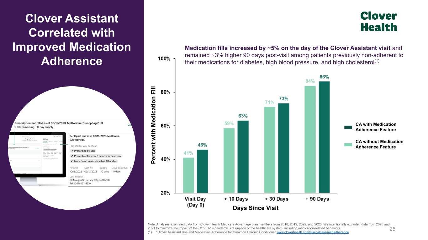 24 Earlier Diabetes Treatment Leads to: Note: This slide reflects our examination of data from Clover Health members who had no previously recorded diagnosis of diabetes, were flagged by the ‘at-risk’ algorithm in Clover Assistant, and where the clinician had a visit informed by Clover Assistant data (2018 - 2022) and the clinician confirmed diabetes. (1) “Clover Assistant Use and Diagnosis, Treatment, and Progression of Diabetes” www.cloverhealth.com/clinicalcare/diabetes Better Management of Blood Sugar(1) Lower Use of Insulin(1) Lower Instances of Hypoglycemia(1) Oral Meds Started Oral Meds Started Non-CA Patients CA Patients Time (Years) B lo od S ug ar In di ca to r (H bA 1c ) Non-CA Patients CA Patients Pe rc en ta ge T ak in g In su lin Days Since Oral Meds Started Non-CA Patients CA Patients Pe rc en ta ge w ith H yp og ly ce m ia E ve nt Days Since Oral Meds Started