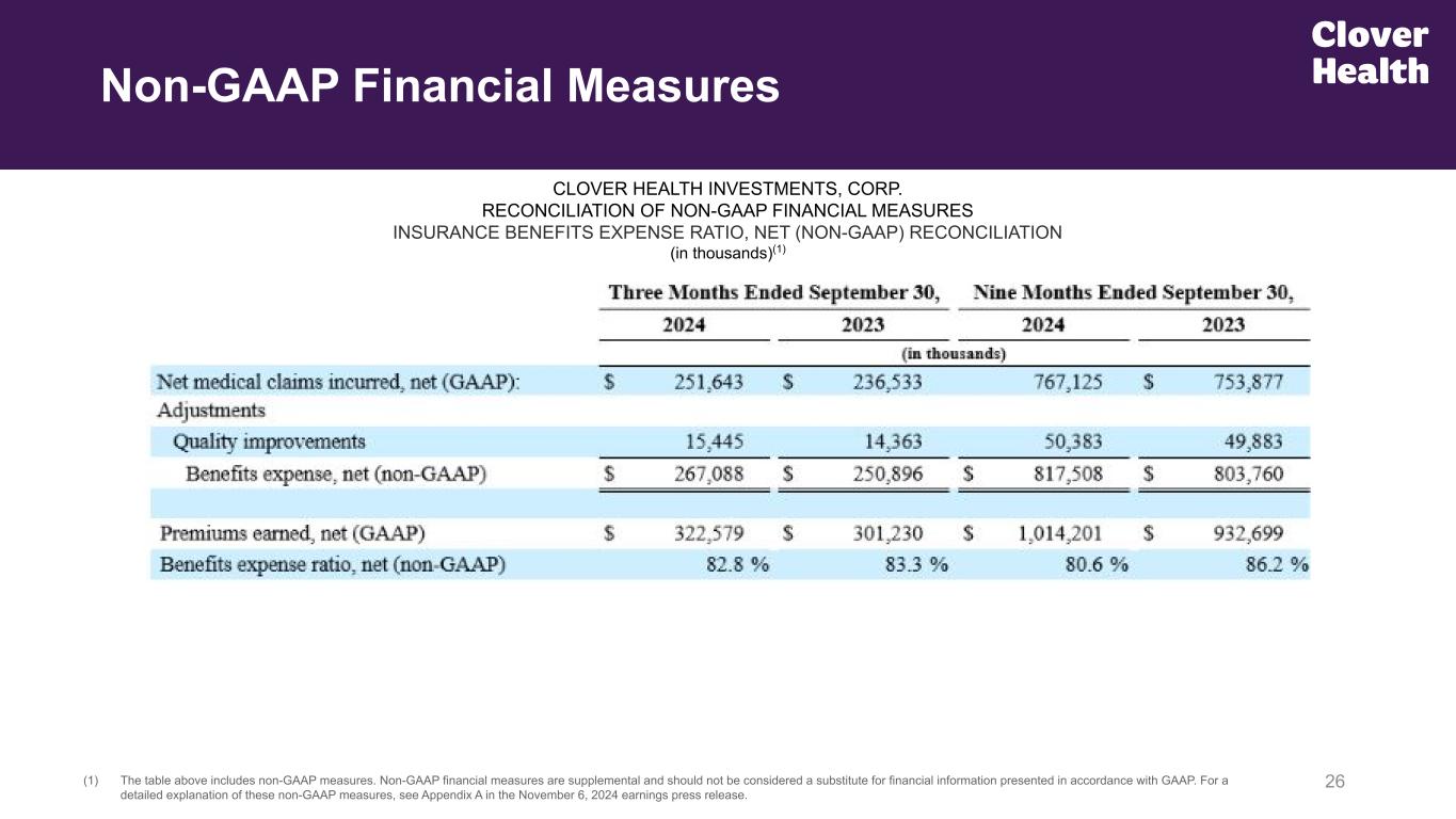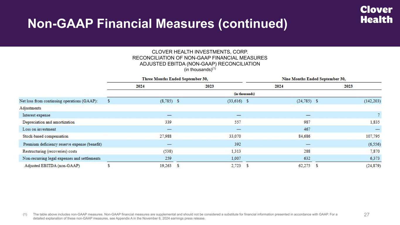 26(1) The table above includes non-GAAP measures. Non-GAAP financial measures are supplemental and should not be considered a substitute for financial information presented in accordance with GAAP. For a detailed explanation of these non-GAAP measures, see Appendix A in the November 6, 2024 earnings press release. CLOVER HEALTH INVESTMENTS, CORP. RECONCILIATION OF NON-GAAP FINANCIAL MEASURES INSURANCE BENEFITS EXPENSE RATIO, NET (NON-GAAP) RECONCILIATION (in thousands)(1) Non-GAAP Financial Measures