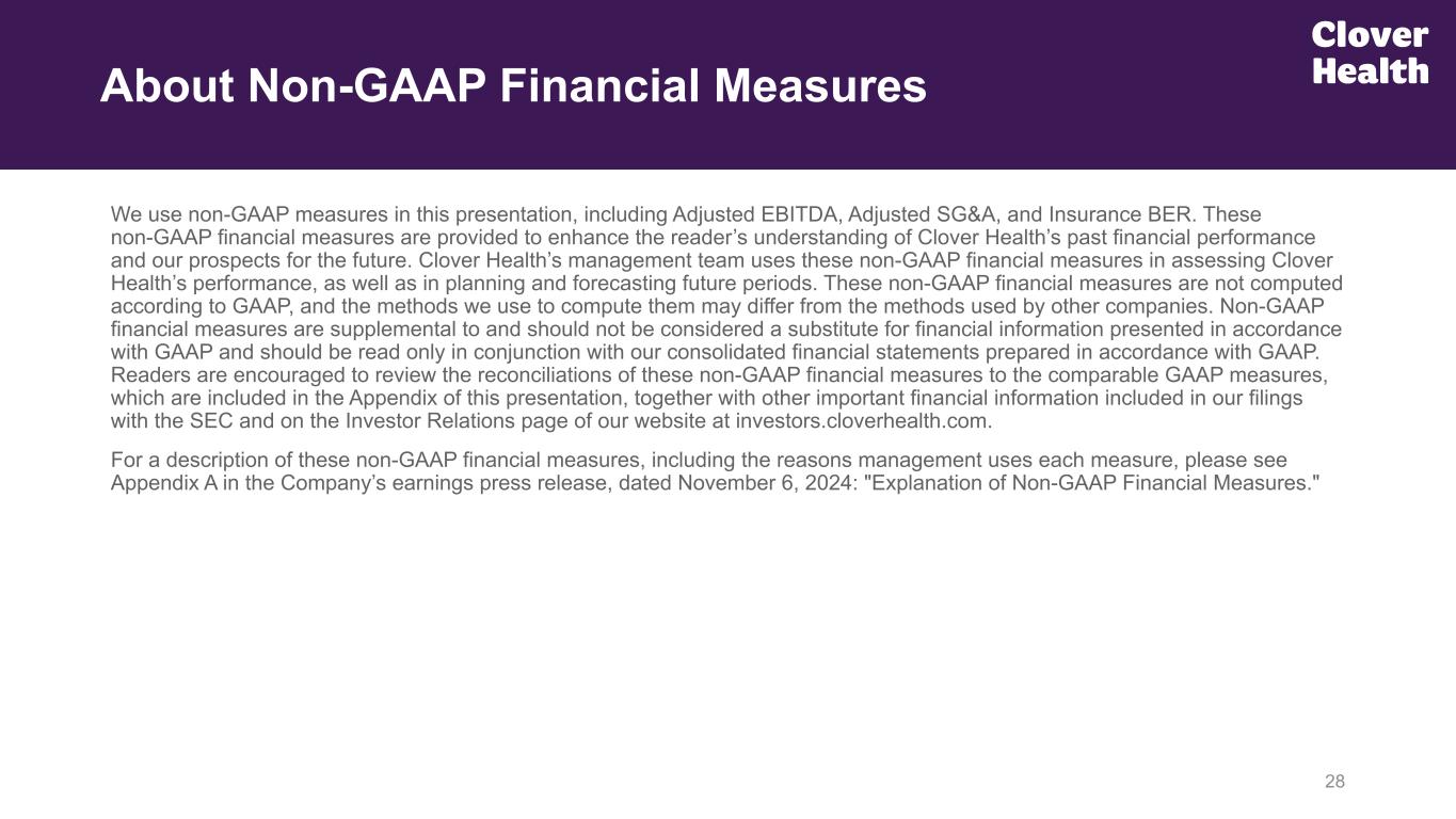 27(1) The table above includes non-GAAP measures. Non-GAAP financial measures are supplemental and should not be considered a substitute for financial information presented in accordance with GAAP. For a detailed explanation of these non-GAAP measures, see Appendix A in the November 6, 2024 earnings press release. CLOVER HEALTH INVESTMENTS, CORP. RECONCILIATION OF NON-GAAP FINANCIAL MEASURES ADJUSTED EBITDA (NON-GAAP) RECONCILIATION (in thousands)(1) Non-GAAP Financial Measures (continued)