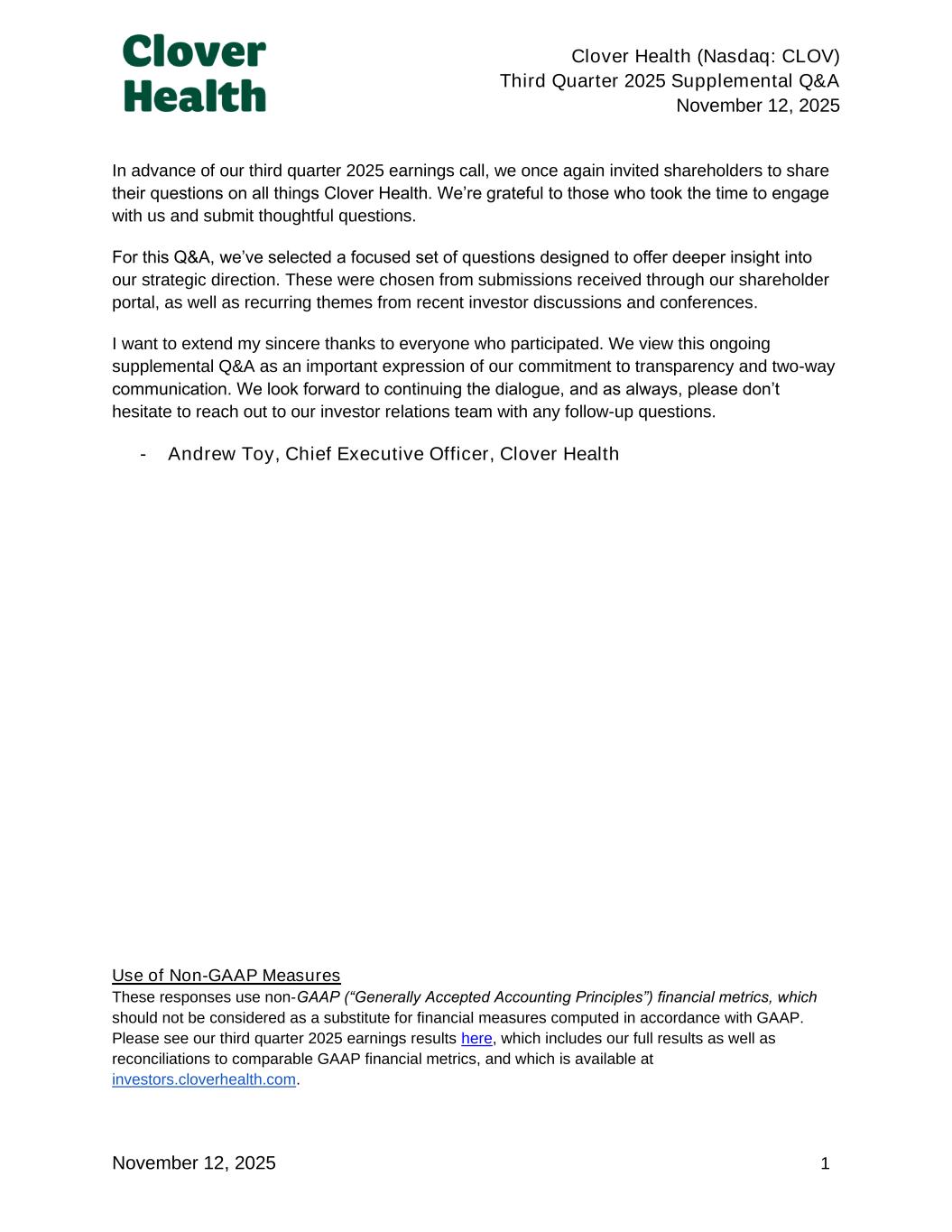 Clover Health (Nasdaq: CLOV) Third Quarter 2025 Supplemental Q&A November 12, 2025 November 12, 2025 1 In advance of our third quarter 2025 earnings call, we once again invited shareholders to share their questions on all things Clover Health. We’re grateful to those who took the time to engage with us and submit thoughtful questions. For this Q&A, we’ve selected a focused set of questions designed to offer deeper insight into our strategic direction. These were chosen from submissions received through our shareholder portal, as well as recurring themes from recent investor discussions and conferences. I want to extend my sincere thanks to everyone who participated. We view this ongoing supplemental Q&A as an important expression of our commitment to transparency and two-way communication. We look forward to continuing the dialogue, and as always, please don’t hesitate to reach out to our investor relations team with any follow-up questions. - Andrew Toy, Chief Executive Officer, Clover Health Use of Non-GAAP Measures These responses use non-GAAP (“Generally Accepted Accounting Principles”) financial metrics, which should not be considered as a substitute for financial measures computed in accordance with GAAP. Please see our third quarter 2025 earnings results here, which includes our full results as well as reconciliations to comparable GAAP financial metrics, and which is available at investors.cloverhealth.com.