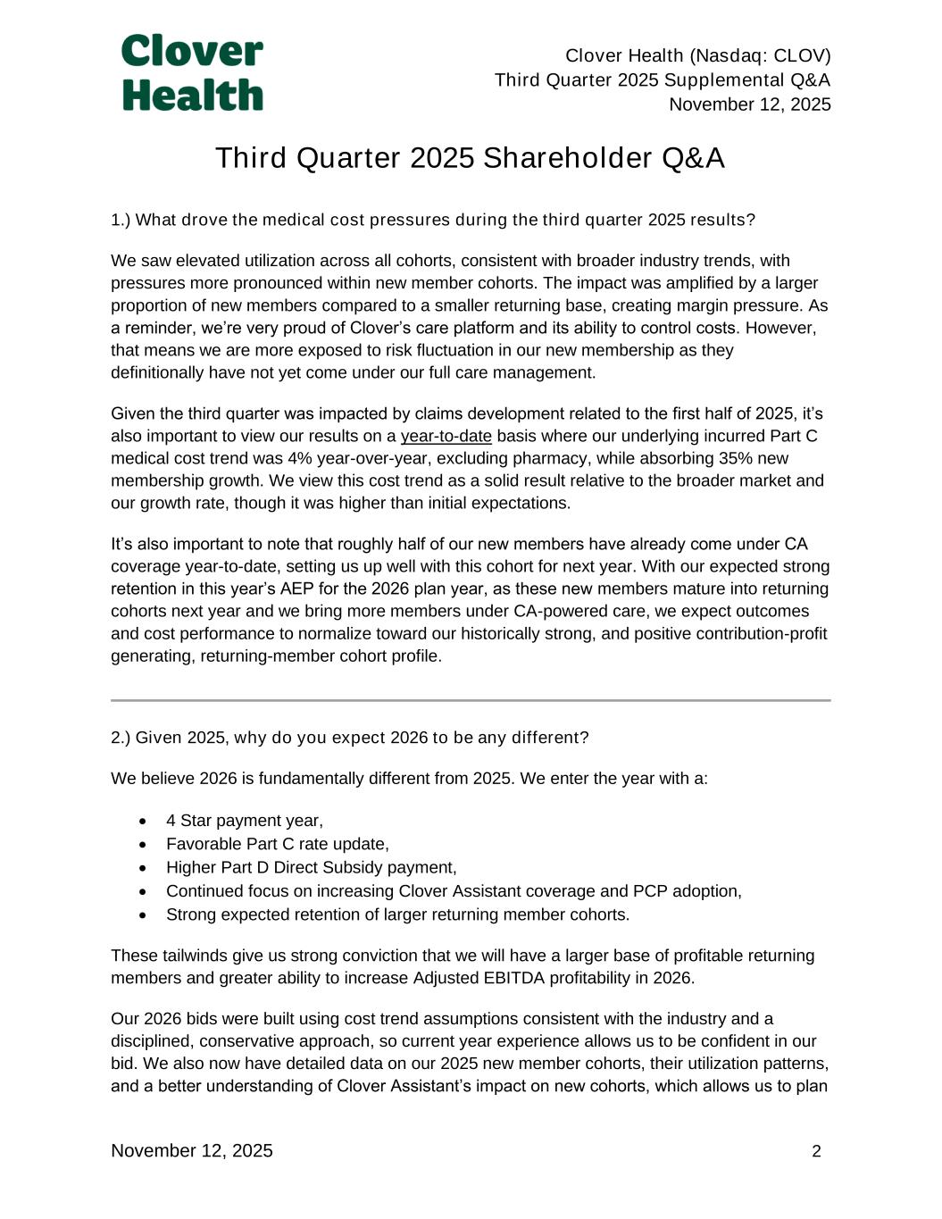 Clover Health (Nasdaq: CLOV) Third Quarter 2025 Supplemental Q&A November 12, 2025 November 12, 2025 2 Third Quarter 2025 Shareholder Q&A 1.) What drove the medical cost pressures during the third quarter 2025 results? We saw elevated utilization across all cohorts, consistent with broader industry trends, with pressures more pronounced within new member cohorts. The impact was amplified by a larger proportion of new members compared to a smaller returning base, creating margin pressure. As a reminder, we’re very proud of Clover’s care platform and its ability to control costs. However, that means we are more exposed to risk fluctuation in our new membership as they definitionally have not yet come under our full care management. Given the third quarter was impacted by claims development related to the first half of 2025, it’s also important to view our results on a year-to-date basis where our underlying incurred Part C medical cost trend was 4% year-over-year, excluding pharmacy, while absorbing 35% new membership growth. We view this cost trend as a solid result relative to the broader market and our growth rate, though it was higher than initial expectations. It’s also important to note that roughly half of our new members have already come under CA coverage year-to-date, setting us up well with this cohort for next year. With our expected strong retention in this year’s AEP for the 2026 plan year, as these new members mature into returning cohorts next year and we bring more members under CA-powered care, we expect outcomes and cost performance to normalize toward our historically strong, and positive contribution-profit generating, returning-member cohort profile. 2.) Given 2025, why do you expect 2026 to be any different? We believe 2026 is fundamentally different from 2025. We enter the year with a: • 4 Star payment year, • Favorable Part C rate update, • Higher Part D Direct Subsidy payment, • Continued focus on increasing Clover Assistant coverage and PCP adoption, • Strong expected retention of larger returning member cohorts. These tailwinds give us strong conviction that we will have a larger base of profitable returning members and greater ability to increase Adjusted EBITDA profitability in 2026. Our 2026 bids were built using cost trend assumptions consistent with the industry and a disciplined, conservative approach, so current year experience allows us to be confident in our bid. We also now have detailed data on our 2025 new member cohorts, their utilization patterns, and a better understanding of Clover Assistant’s impact on new cohorts, which allows us to plan