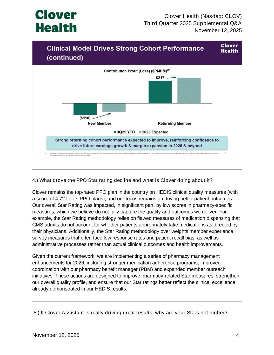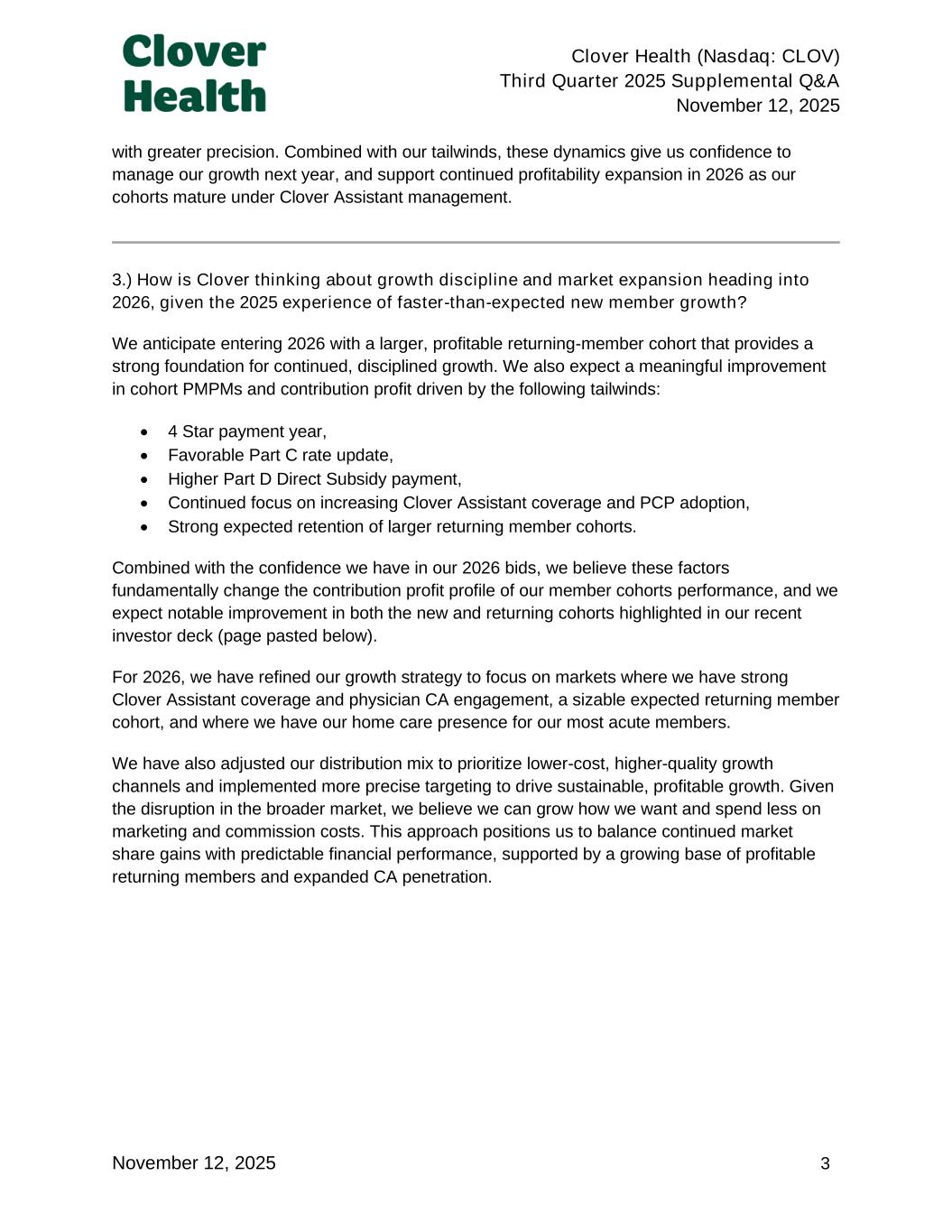 Clover Health (Nasdaq: CLOV) Third Quarter 2025 Supplemental Q&A November 12, 2025 November 12, 2025 3 with greater precision. Combined with our tailwinds, these dynamics give us confidence to manage our growth next year, and support continued profitability expansion in 2026 as our cohorts mature under Clover Assistant management. 3.) How is Clover thinking about growth discipline and market expansion heading into 2026, given the 2025 experience of faster-than-expected new member growth? We anticipate entering 2026 with a larger, profitable returning-member cohort that provides a strong foundation for continued, disciplined growth. We also expect a meaningful improvement in cohort PMPMs and contribution profit driven by the following tailwinds: • 4 Star payment year, • Favorable Part C rate update, • Higher Part D Direct Subsidy payment, • Continued focus on increasing Clover Assistant coverage and PCP adoption, • Strong expected retention of larger returning member cohorts. Combined with the confidence we have in our 2026 bids, we believe these factors fundamentally change the contribution profit profile of our member cohorts performance, and we expect notable improvement in both the new and returning cohorts highlighted in our recent investor deck (page pasted below). For 2026, we have refined our growth strategy to focus on markets where we have strong Clover Assistant coverage and physician CA engagement, a sizable expected returning member cohort, and where we have our home care presence for our most acute members. We have also adjusted our distribution mix to prioritize lower-cost, higher-quality growth channels and implemented more precise targeting to drive sustainable, profitable growth. Given the disruption in the broader market, we believe we can grow how we want and spend less on marketing and commission costs. This approach positions us to balance continued market share gains with predictable financial performance, supported by a growing base of profitable returning members and expanded CA penetration.
