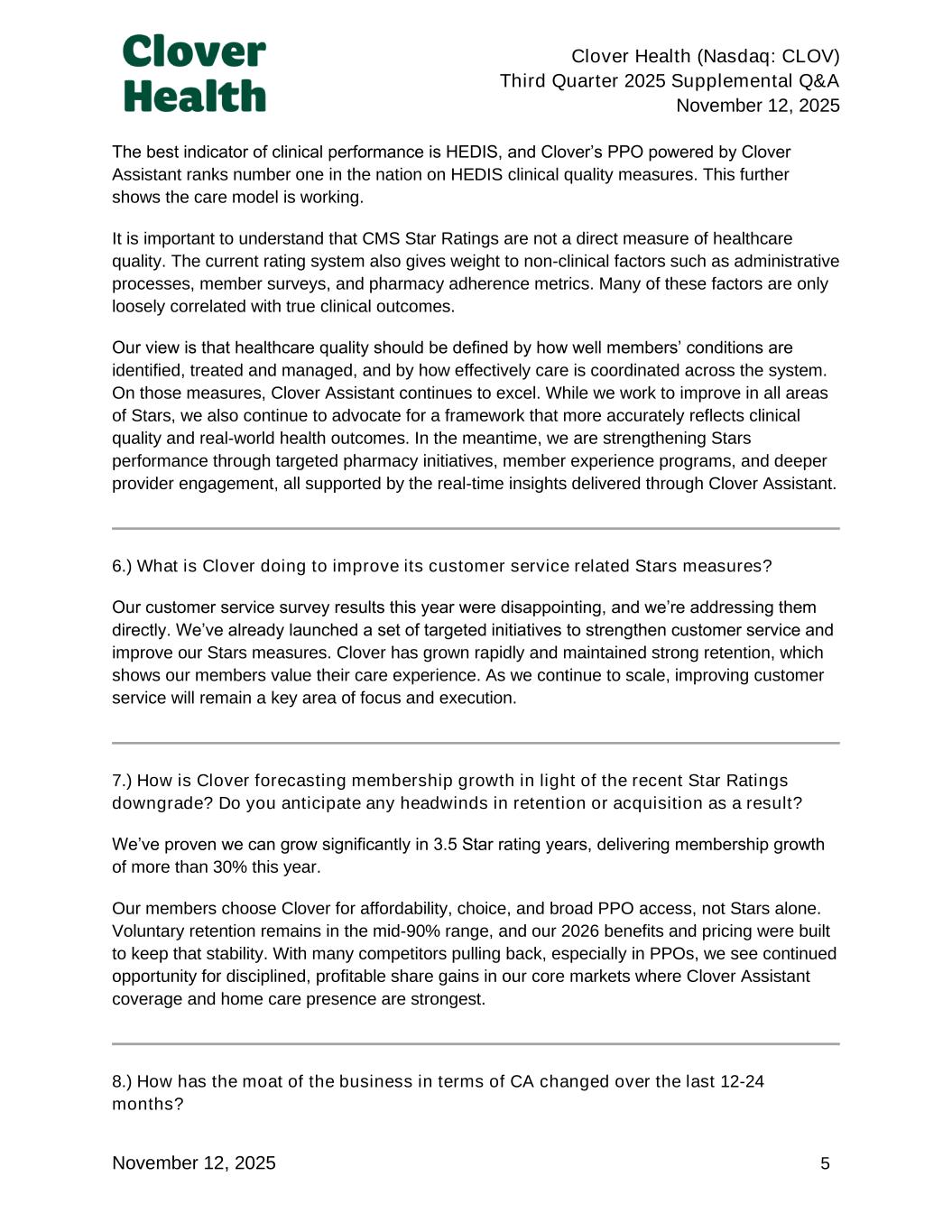 Clover Health (Nasdaq: CLOV) Third Quarter 2025 Supplemental Q&A November 12, 2025 November 12, 2025 5 The best indicator of clinical performance is HEDIS, and Clover’s PPO powered by Clover Assistant ranks number one in the nation on HEDIS clinical quality measures. This further shows the care model is working. It is important to understand that CMS Star Ratings are not a direct measure of healthcare quality. The current rating system also gives weight to non-clinical factors such as administrative processes, member surveys, and pharmacy adherence metrics. Many of these factors are only loosely correlated with true clinical outcomes. Our view is that healthcare quality should be defined by how well members’ conditions are identified, treated and managed, and by how effectively care is coordinated across the system. On those measures, Clover Assistant continues to excel. While we work to improve in all areas of Stars, we also continue to advocate for a framework that more accurately reflects clinical quality and real-world health outcomes. In the meantime, we are strengthening Stars performance through targeted pharmacy initiatives, member experience programs, and deeper provider engagement, all supported by the real-time insights delivered through Clover Assistant. 6.) What is Clover doing to improve its customer service related Stars measures? Our customer service survey results this year were disappointing, and we’re addressing them directly. We’ve already launched a set of targeted initiatives to strengthen customer service and improve our Stars measures. Clover has grown rapidly and maintained strong retention, which shows our members value their care experience. As we continue to scale, improving customer service will remain a key area of focus and execution. 7.) How is Clover forecasting membership growth in light of the recent Star Ratings downgrade? Do you anticipate any headwinds in retention or acquisition as a result? We’ve proven we can grow significantly in 3.5 Star rating years, delivering membership growth of more than 30% this year. Our members choose Clover for affordability, choice, and broad PPO access, not Stars alone. Voluntary retention remains in the mid-90% range, and our 2026 benefits and pricing were built to keep that stability. With many competitors pulling back, especially in PPOs, we see continued opportunity for disciplined, profitable share gains in our core markets where Clover Assistant coverage and home care presence are strongest. 8.) How has the moat of the business in terms of CA changed over the last 12-24 months?