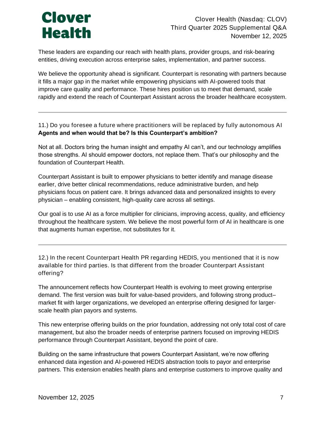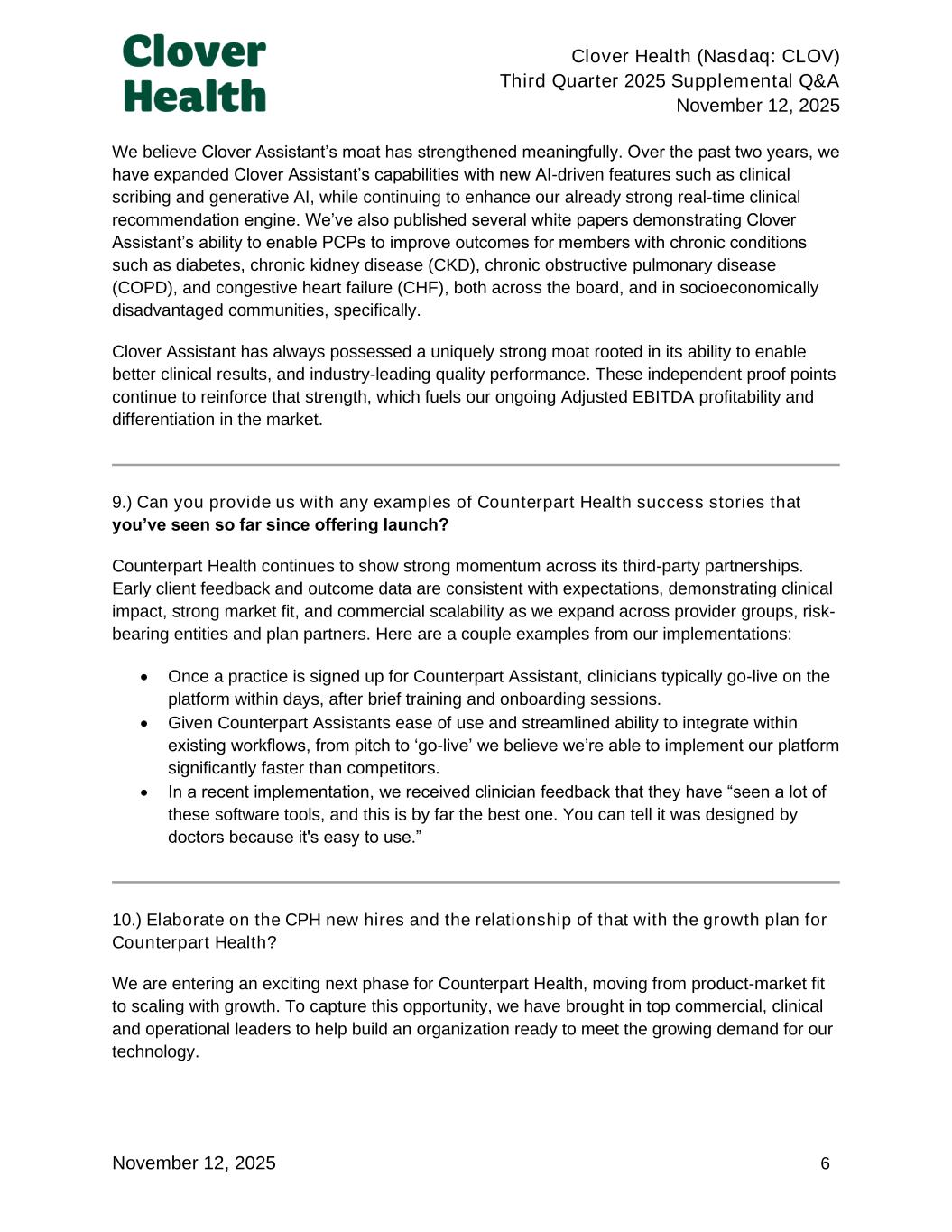Clover Health (Nasdaq: CLOV) Third Quarter 2025 Supplemental Q&A November 12, 2025 November 12, 2025 6 We believe Clover Assistant’s moat has strengthened meaningfully. Over the past two years, we have expanded Clover Assistant’s capabilities with new AI-driven features such as clinical scribing and generative AI, while continuing to enhance our already strong real-time clinical recommendation engine. We’ve also published several white papers demonstrating Clover Assistant’s ability to enable PCPs to improve outcomes for members with chronic conditions such as diabetes, chronic kidney disease (CKD), chronic obstructive pulmonary disease (COPD), and congestive heart failure (CHF), both across the board, and in socioeconomically disadvantaged communities, specifically. Clover Assistant has always possessed a uniquely strong moat rooted in its ability to enable better clinical results, and industry-leading quality performance. These independent proof points continue to reinforce that strength, which fuels our ongoing Adjusted EBITDA profitability and differentiation in the market. 9.) Can you provide us with any examples of Counterpart Health success stories that you’ve seen so far since offering launch? Counterpart Health continues to show strong momentum across its third-party partnerships. Early client feedback and outcome data are consistent with expectations, demonstrating clinical impact, strong market fit, and commercial scalability as we expand across provider groups, risk- bearing entities and plan partners. Here are a couple examples from our implementations: • Once a practice is signed up for Counterpart Assistant, clinicians typically go-live on the platform within days, after brief training and onboarding sessions. • Given Counterpart Assistants ease of use and streamlined ability to integrate within existing workflows, from pitch to ‘go-live’ we believe we’re able to implement our platform significantly faster than competitors. • In a recent implementation, we received clinician feedback that they have “seen a lot of these software tools, and this is by far the best one. You can tell it was designed by doctors because it's easy to use.” 10.) Elaborate on the CPH new hires and the relationship of that with the growth plan for Counterpart Health? We are entering an exciting next phase for Counterpart Health, moving from product-market fit to scaling with growth. To capture this opportunity, we have brought in top commercial, clinical and operational leaders to help build an organization ready to meet the growing demand for our technology.