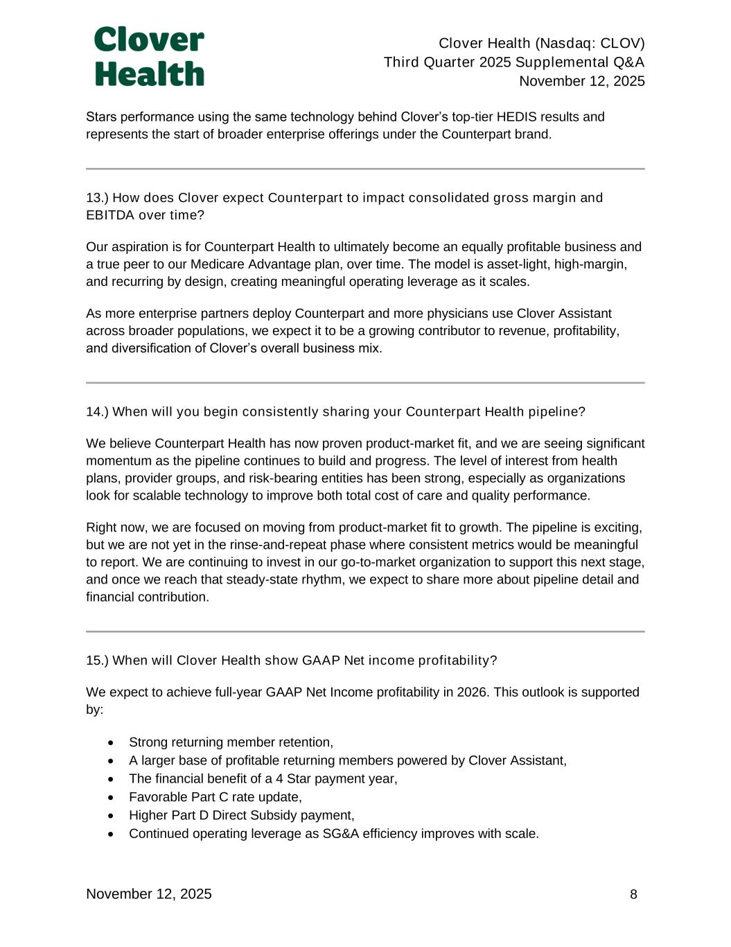 Clover Health (Nasdaq: CLOV) Third Quarter 2025 Supplemental Q&A November 12, 2025 November 12, 2025 8 Stars performance using the same technology behind Clover’s top-tier HEDIS results and represents the start of broader enterprise offerings under the Counterpart brand. 13.) How does Clover expect Counterpart to impact consolidated gross margin and EBITDA over time? Our aspiration is for Counterpart Health to ultimately become an equally profitable business and a true peer to our Medicare Advantage plan, over time. The model is asset-light, high-margin, and recurring by design, creating meaningful operating leverage as it scales. As more enterprise partners deploy Counterpart and more physicians use Clover Assistant across broader populations, we expect it to be a growing contributor to revenue, profitability, and diversification of Clover’s overall business mix. 14.) When will you begin consistently sharing your Counterpart Health pipeline? We believe Counterpart Health has now proven product-market fit, and we are seeing significant momentum as the pipeline continues to build and progress. The level of interest from health plans, provider groups, and risk-bearing entities has been strong, especially as organizations look for scalable technology to improve both total cost of care and quality performance. Right now, we are focused on moving from product-market fit to growth. The pipeline is exciting, but we are not yet in the rinse-and-repeat phase where consistent metrics would be meaningful to report. We are continuing to invest in our go-to-market organization to support this next stage, and once we reach that steady-state rhythm, we expect to share more about pipeline detail and financial contribution. 15.) When will Clover Health show GAAP Net income profitability? We expect to achieve full-year GAAP Net Income profitability in 2026. This outlook is supported by: • Strong returning member retention, • A larger base of profitable returning members powered by Clover Assistant, • The financial benefit of a 4 Star payment year, • Favorable Part C rate update, • Higher Part D Direct Subsidy payment, • Continued operating leverage as SG&A efficiency improves with scale.