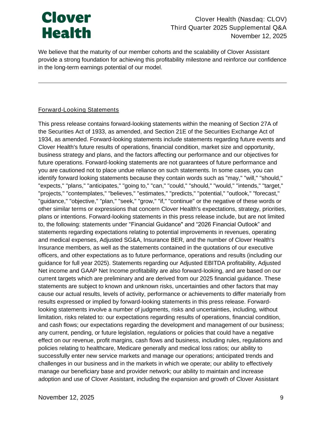 Clover Health (Nasdaq: CLOV) Third Quarter 2025 Supplemental Q&A November 12, 2025 November 12, 2025 9 We believe that the maturity of our member cohorts and the scalability of Clover Assistant provide a strong foundation for achieving this profitability milestone and reinforce our confidence in the long-term earnings potential of our model. Forward-Looking Statements This press release contains forward-looking statements within the meaning of Section 27A of the Securities Act of 1933, as amended, and Section 21E of the Securities Exchange Act of 1934, as amended. Forward-looking statements include statements regarding future events and Clover Health's future results of operations, financial condition, market size and opportunity, business strategy and plans, and the factors affecting our performance and our objectives for future operations. Forward-looking statements are not guarantees of future performance and you are cautioned not to place undue reliance on such statements. In some cases, you can identify forward looking statements because they contain words such as "may," "will," "should," "expects," "plans," "anticipates," "going to," "can," "could," "should," "would," "intends," "target," "projects," "contemplates," "believes," "estimates," "predicts," "potential," "outlook," "forecast," "guidance," "objective," "plan," "seek," "grow," "if," "continue" or the negative of these words or other similar terms or expressions that concern Clover Health's expectations, strategy, priorities, plans or intentions. Forward-looking statements in this press release include, but are not limited to, the following: statements under "Financial Guidance" and “2026 Financial Outlook” and statements regarding expectations relating to potential improvements in revenues, operating and medical expenses, Adjusted SG&A, Insurance BER, and the number of Clover Health's Insurance members, as well as the statements contained in the quotations of our executive officers, and other expectations as to future performance, operations and results (including our guidance for full year 2025). Statements regarding our Adjusted EBITDA profitability, Adjusted Net income and GAAP Net Income profitability are also forward-looking, and are based on our current targets which are preliminary and are derived from our 2025 financial guidance. These statements are subject to known and unknown risks, uncertainties and other factors that may cause our actual results, levels of activity, performance or achievements to differ materially from results expressed or implied by forward-looking statements in this press release. Forward- looking statements involve a number of judgments, risks and uncertainties, including, without limitation, risks related to: our expectations regarding results of operations, financial condition, and cash flows; our expectations regarding the development and management of our business; any current, pending, or future legislation, regulations or policies that could have a negative effect on our revenue, profit margins, cash flows and business, including rules, regulations and policies relating to healthcare, Medicare generally and medical loss ratios; our ability to successfully enter new service markets and manage our operations; anticipated trends and challenges in our business and in the markets in which we operate; our ability to effectively manage our beneficiary base and provider network; our ability to maintain and increase adoption and use of Clover Assistant, including the expansion and growth of Clover Assistant
