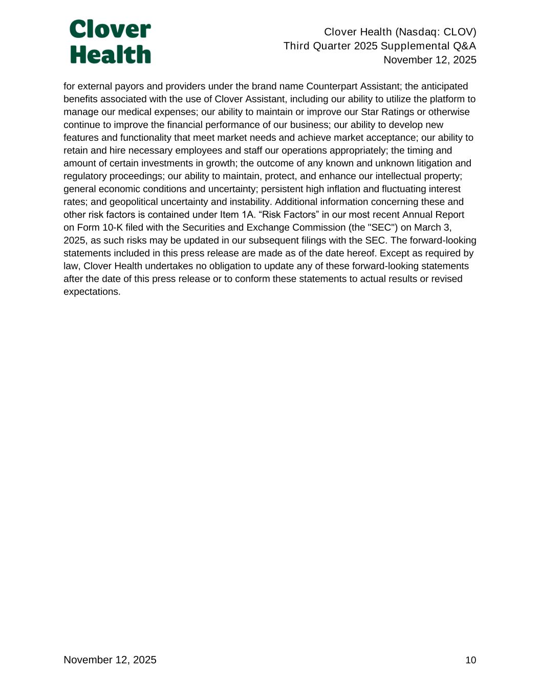 Clover Health (Nasdaq: CLOV) Third Quarter 2025 Supplemental Q&A November 12, 2025 November 12, 2025 10 for external payors and providers under the brand name Counterpart Assistant; the anticipated benefits associated with the use of Clover Assistant, including our ability to utilize the platform to manage our medical expenses; our ability to maintain or improve our Star Ratings or otherwise continue to improve the financial performance of our business; our ability to develop new features and functionality that meet market needs and achieve market acceptance; our ability to retain and hire necessary employees and staff our operations appropriately; the timing and amount of certain investments in growth; the outcome of any known and unknown litigation and regulatory proceedings; our ability to maintain, protect, and enhance our intellectual property; general economic conditions and uncertainty; persistent high inflation and fluctuating interest rates; and geopolitical uncertainty and instability. Additional information concerning these and other risk factors is contained under Item 1A. “Risk Factors” in our most recent Annual Report on Form 10-K filed with the Securities and Exchange Commission (the "SEC") on March 3, 2025, as such risks may be updated in our subsequent filings with the SEC. The forward-looking statements included in this press release are made as of the date hereof. Except as required by law, Clover Health undertakes no obligation to update any of these forward-looking statements after the date of this press release or to conform these statements to actual results or revised expectations.