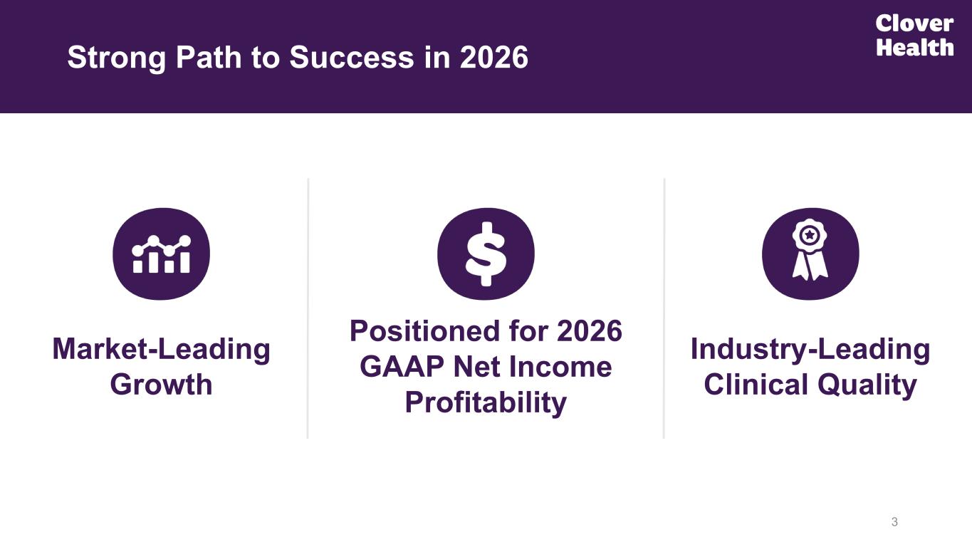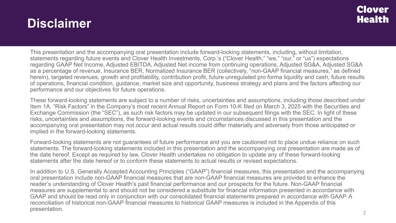 This presentation and the accompanying oral presentation include forward-looking statements, including, without limitation, statements regarding future events and Clover Health Investments, Corp.’s (“Clover Health,” “we,” “our,” or “us”) expectations regarding GAAP Net Income, Adjusted EBITDA, Adjusted Net income from continuing operations, Adjusted SG&A, Adjusted SG&A as a percentage of revenue, Insurance BER, Normalized Insurance BER (collectively, “non-GAAP financial measures,” as defined herein), targeted revenues, growth and profitability, contribution profit, future unregulated pro forma liquidity and cash, future results of operations, financial condition, guidance, market size and opportunity, business strategy and plans and the factors affecting our performance and our objectives for future operations. These forward-looking statements are subject to a number of risks, uncertainties and assumptions, including those described under Item 1A. “Risk Factors” in the Company’s most recent Annual Report on Form 10-K filed on March 3, 2025 with the Securities and Exchange Commission (the “SEC”), as such risk factors may be updated in our subsequent filings with the SEC. In light of these risks, uncertainties and assumptions, the forward-looking events and circumstances discussed in this presentation and the accompanying oral presentation may not occur and actual results could differ materially and adversely from those anticipated or implied in the forward-looking statements. Forward-looking statements are not guarantees of future performance and you are cautioned not to place undue reliance on such statements. The forward-looking statements included in this presentation and the accompanying oral presentation are made as of the date hereof. Except as required by law, Clover Health undertakes no obligation to update any of these forward-looking statements after the date hereof or to conform these statements to actual results or revised expectations. In addition to U.S. Generally Accepted Accounting Principles (“GAAP”) financial measures, this presentation and the accompanying oral presentation include non-GAAP financial measures that are non-GAAP financial measures are provided to enhance the reader’s understanding of Clover Health’s past financial performance and our prospects for the future. Non-GAAP financial measures are supplemental to and should not be considered a substitute for financial information presented in accordance with GAAP and should be read only in conjunction with our consolidated financial statements prepared in accordance with GAAP. A reconciliation of historical non-GAAP financial measures to historical GAAP measures is included in the Appendix of this presentation. 2 Disclaimer