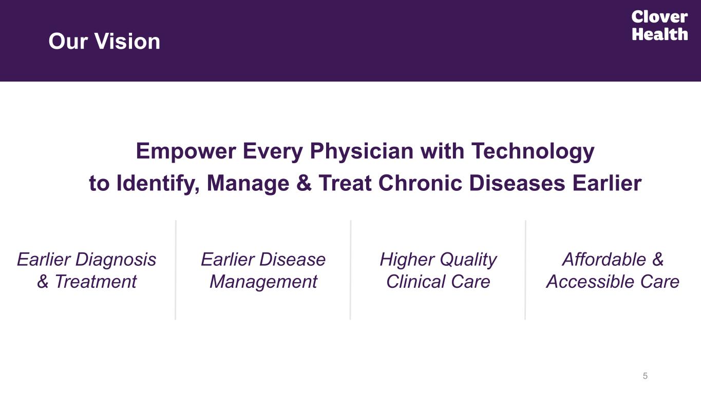 ~97% of members in current 4 Star payment year PPO Increasing 3rd party customers & onboarding more clinicians onto CA Strong medical cost trend & cohort economics, gaining SG&A leverage 4 2025 Accomplishments #1 PPO Plan Nationally on HEDIS Quality(3) Targeting Sustained Adjusted EBITDA Profitability(2) High retention in core markets, MA switchers, minimal e-broker exposure Rapidly Expanding CPH 3rd Party CA Use 2026 AEP Growth +53%, up from +27% in 2025(1) (1) Medicare Advantage membership growth as of the beginning of January 2026 as compared to January 2025, and beginning of January 2025 compared to January 2024. (2) Adjusted EBITDA is a non-GAAP financial measure. We define Adjusted EBITDA as Net Income (Loss) from continuing operations before depreciation and amortization, loss on investment, stock-based compensation, premium deficiency reserve expense (benefit), restructuring (recoveries) costs, and non-recurring legal expenses and settlements. Adjusted EBITDA performance during the full-year 2025 is based on previously provided FY25 guidance in association with Clover Health’s November 4, 2025 earnings 8-K, and has not been updated since that time. (3) Achieved 4.94 and 4.72 out of 5 Stars on HEDIS measures for Star Rating years 2025 and 2026, respectively, both the top-performing score on core HEDIS measures for PPO Medicare Advantage plans nationwide. This analysis focuses on performance by non-SNP PPO plans with over 2,000 lives as of September 1, 2025 on HEDIS measures applicable to non-SNPs that were used for CMS’s MY 2023 & 2024 Star ratings, applying the measure ranges used by CMS. Clover Health will be paid on 4.0 Stars for its flagship PPO plans in Payment Year 2026; percentage of members in PPO plans is based on the month beginning January 2026 membership. Expect FY26 GAAP Net Income Profitability