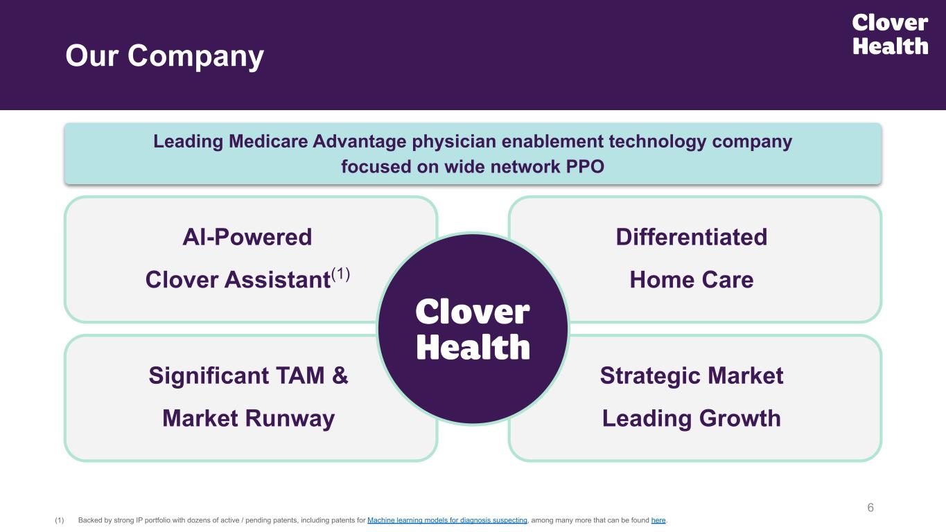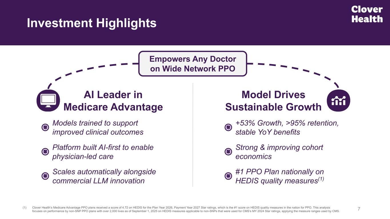 6 Our Company (1) Backed by strong IP portfolio with dozens of active / pending patents, including patents for Machine learning models for diagnosis suspecting, among many more that can be found here. Significant TAM & Market Runway AI-Powered Clover Assistant(1) Leading Medicare Advantage physician enablement technology company focused on wide network PPO Differentiated Home Care Strategic Market Leading Growth