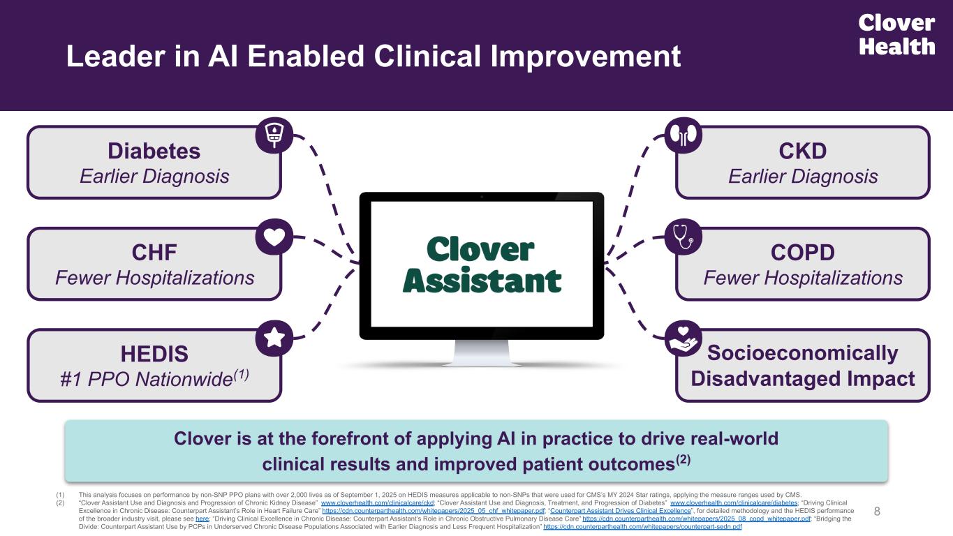 Investment Highlights 7 AI Leader in Medicare Advantage Scales automatically alongside commercial LLM innovation Models trained to support improved clinical outcomes Platform built AI-first to enable physician-led care Model Drives Sustainable Growth +53% Growth, >95% retention, stable YoY benefits Strong & improving cohort economics #1 PPO Plan nationally on HEDIS quality measures(1) (1) Clover Health’s Medicare Advantage PPO plans received a score of 4.72 on HEDIS for the Plan Year 2026, Payment Year 2027 Star ratings, which is the #1 score on HEDIS quality measures in the nation for PPO. This analysis focuses on performance by non-SNP PPO plans with over 2,000 lives as of September 1, 2025 on HEDIS measures applicable to non-SNPs that were used for CMS’s MY 2024 Star ratings, applying the measure ranges used by CMS. Empowers Any Doctor on Wide Network PPO