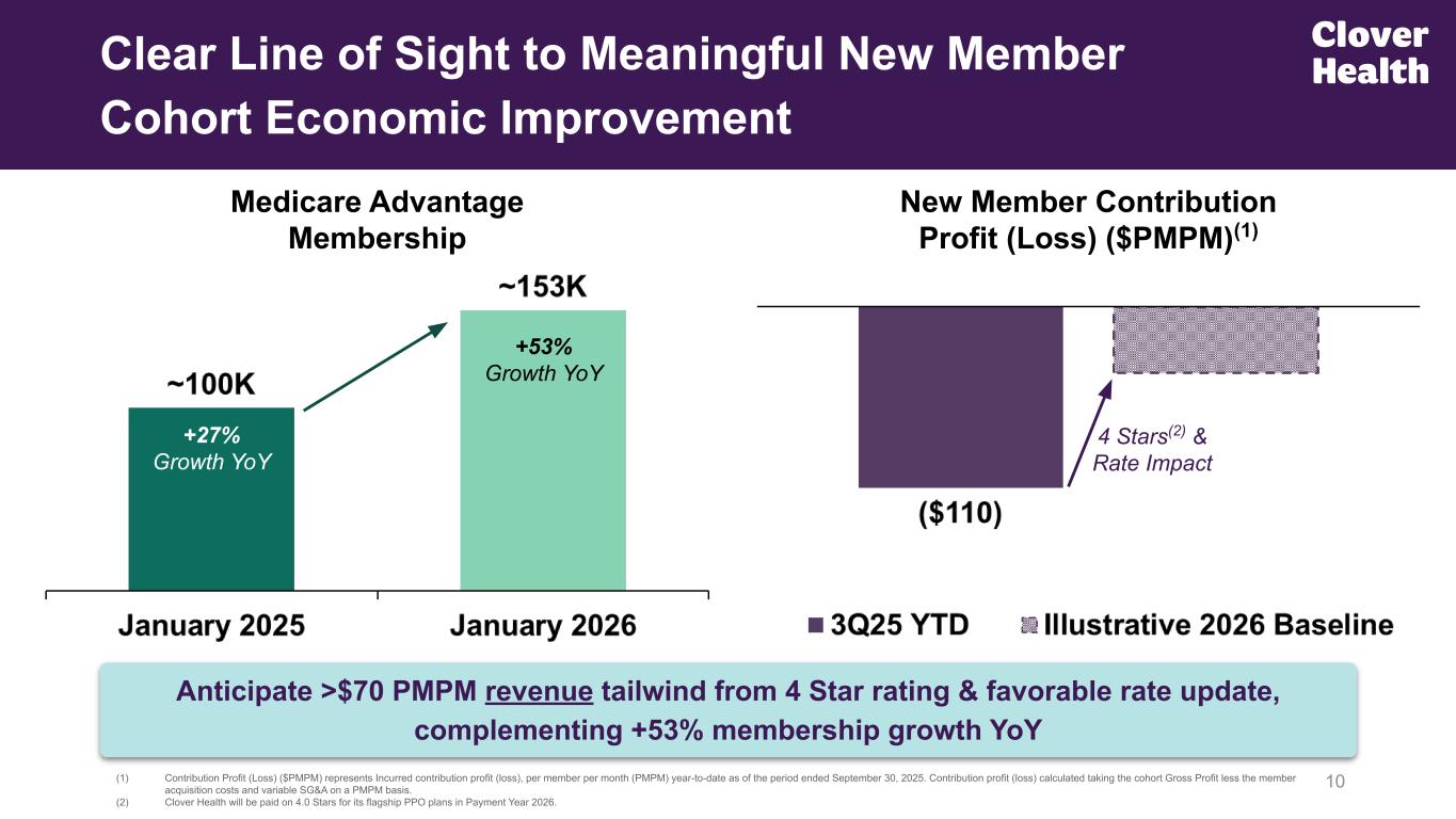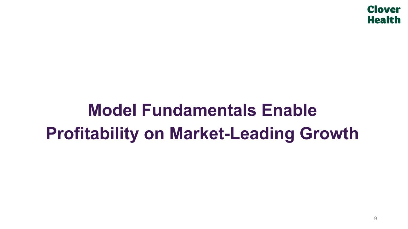 8 Diabetes Earlier Diagnosis (1) This analysis focuses on performance by non-SNP PPO plans with over 2,000 lives as of September 1, 2025 on HEDIS measures applicable to non-SNPs that were used for CMS’s MY 2024 Star ratings, applying the measure ranges used by CMS. (2) “Clover Assistant Use and Diagnosis and Progression of Chronic Kidney Disease” www.cloverhealth.com/clinicalcare/ckd; “Clover Assistant Use and Diagnosis, Treatment, and Progression of Diabetes” www.cloverhealth.com/clinicalcare/diabetes; “Driving Clinical Excellence in Chronic Disease: Counterpart Assistant’s Role in Heart Failure Care” https://cdn.counterparthealth.com/whitepapers/2025_05_chf_whitepaper.pdf; “Counterpart Assistant Drives Clinical Excellence”, for detailed methodology and the HEDIS performance of the broader industry visit, please see here; “Driving Clinical Excellence in Chronic Disease: Counterpart Assistant’s Role in Chronic Obstructive Pulmonary Disease Care” https://cdn.counterparthealth.com/whitepapers/2025_08_copd_whitepaper.pdf; “Bridging the Divide: Counterpart Assistant Use by PCPs in Underserved Chronic Disease Populations Associated with Earlier Diagnosis and Less Frequent Hospitalization” https://cdn.counterparthealth.com/whitepapers/counterpart-sedn.pdf Socioeconomically Disadvantaged Impact COPD Fewer Hospitalizations CHF Fewer Hospitalizations Leader in AI Enabled Clinical Improvement CKD Earlier Diagnosis HEDIS #1 PPO Nationwide(1) Clover is at the forefront of applying AI in practice to drive real-world clinical results and improved patient outcomes(2)