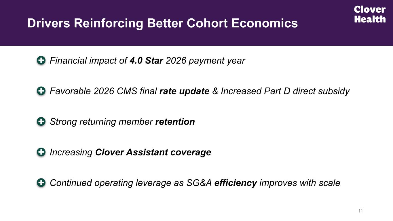 Anticipate >$70 PMPM revenue tailwind from 4 Star rating & favorable rate update, complementing +53% membership growth YoY 10(1) Contribution Profit (Loss) ($PMPM) represents Incurred contribution profit (loss), per member per month (PMPM) year-to-date as of the period ended September 30, 2025. Contribution profit (loss) calculated taking the cohort Gross Profit less the member acquisition costs and variable SG&A on a PMPM basis. (2) Clover Health will be paid on 4.0 Stars for its flagship PPO plans in Payment Year 2026. Clear Line of Sight to Meaningful New Member Cohort Economic Improvement Medicare Advantage Membership New Member Contribution Profit (Loss) ($PMPM)(1) +53% Growth YoY +27% Growth YoY 4 Stars(2) & Rate Impact