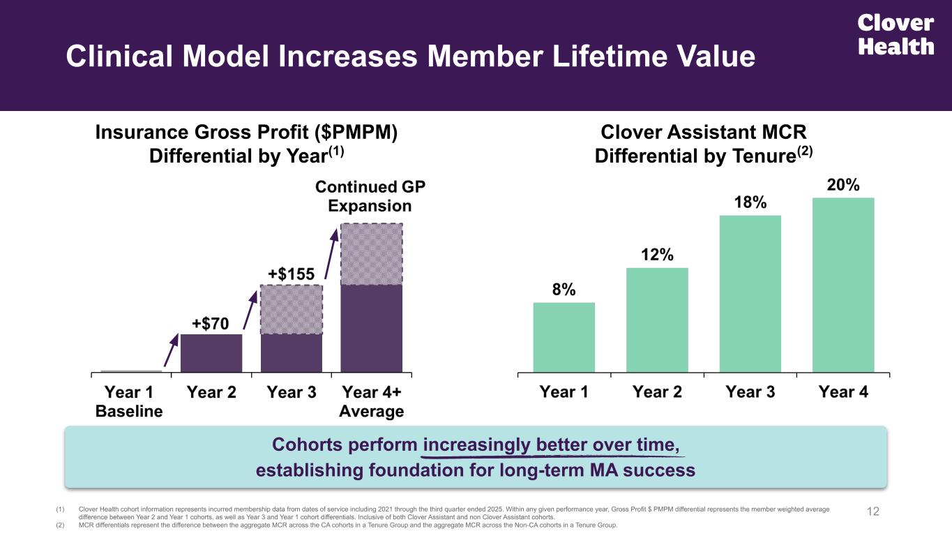 11 Drivers Reinforcing Better Cohort Economics Strong returning member retention Increasing Clover Assistant coverage Continued operating leverage as SG&A efficiency improves with scale Favorable 2026 CMS final rate update & Increased Part D direct subsidy Financial impact of 4.0 Star 2026 payment year