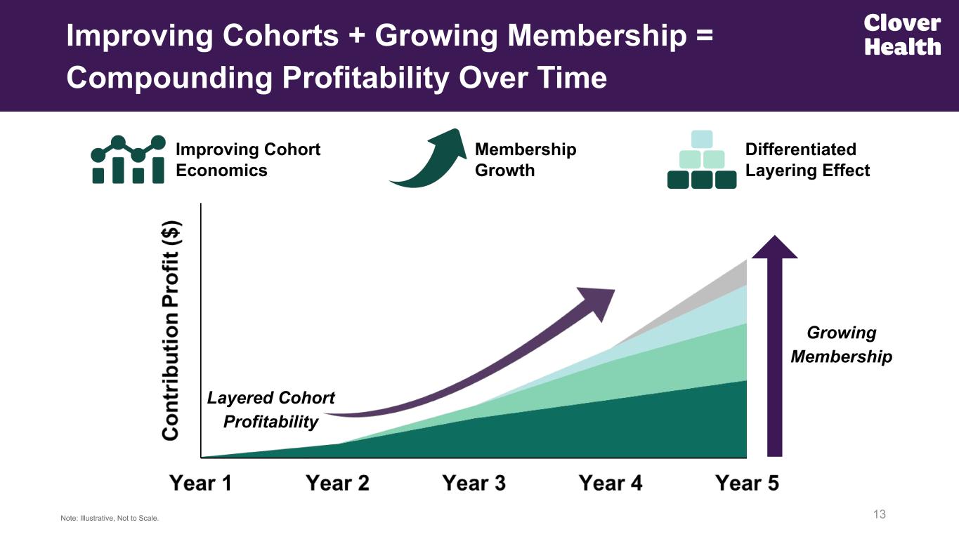 12(1) Clover Health cohort information represents incurred membership data from dates of service including 2021 through the third quarter ended 2025. Within any given performance year, Gross Profit $ PMPM differential represents the member weighted average difference between Year 2 and Year 1 cohorts, as well as Year 3 and Year 1 cohort differentials. Inclusive of both Clover Assistant and non Clover Assistant cohorts. (2) MCR differentials represent the difference between the aggregate MCR across the CA cohorts in a Tenure Group and the aggregate MCR across the Non-CA cohorts in a Tenure Group. Clinical Model Increases Member Lifetime Value Cohorts perform increasingly better over time, establishing foundation for long-term MA success Insurance Gross Profit ($PMPM) Differential by Year(1) Clover Assistant MCR Differential by Tenure(2)