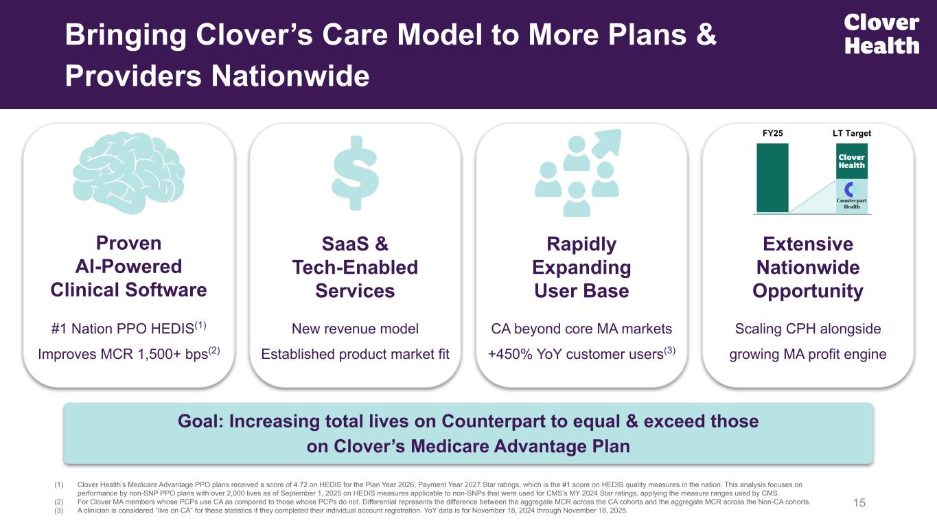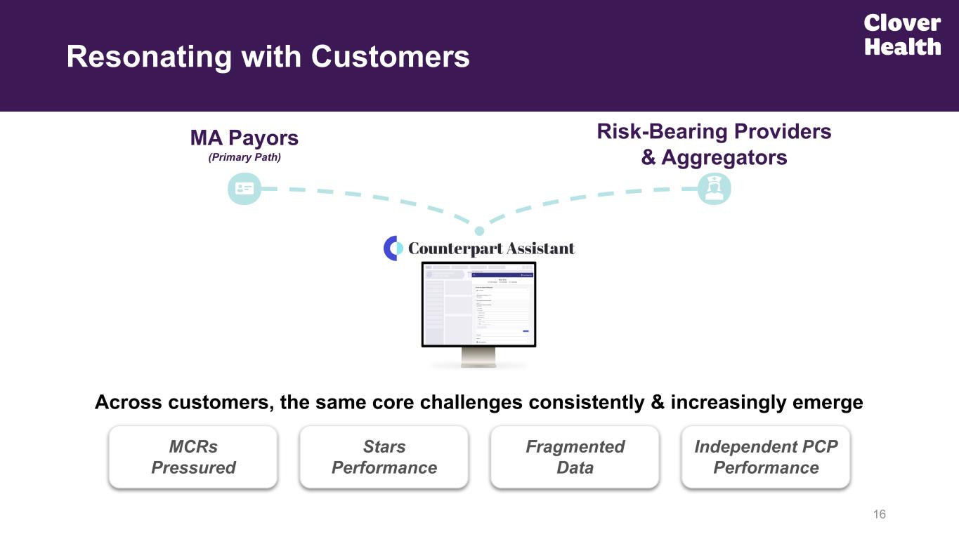 Goal: Increasing total lives on Counterpart to equal & exceed those on Clover’s Medicare Advantage Plan (1) Clover Health’s Medicare Advantage PPO plans received a score of 4.72 on HEDIS for the Plan Year 2026, Payment Year 2027 Star ratings, which is the #1 score on HEDIS quality measures in the nation. This analysis focuses on performance by non-SNP PPO plans with over 2,000 lives as of September 1, 2025 on HEDIS measures applicable to non-SNPs that were used for CMS’s MY 2024 Star ratings, applying the measure ranges used by CMS. (2) For Clover MA members whose PCPs use CA as compared to those whose PCPs do not. Differential represents the difference between the aggregate MCR across the CA cohorts and the aggregate MCR across the Non-CA cohorts. (3) A clinician is considered “live on CA” for these statistics if they completed their individual account registration. YoY data is for November 18, 2024 through November 18, 2025. Bringing Clover’s Care Model to More Plans & Providers Nationwide 15 Proven AI-Powered Clinical Software SaaS & Tech-Enabled Services Rapidly Expanding User Base Extensive Nationwide Opportunity New revenue model Established product market fit #1 Nation PPO HEDIS(1) Improves MCR 1,500+ bps(2) CA beyond core MA markets +450% YoY customer users(3) Scaling CPH alongside growing MA profit engine