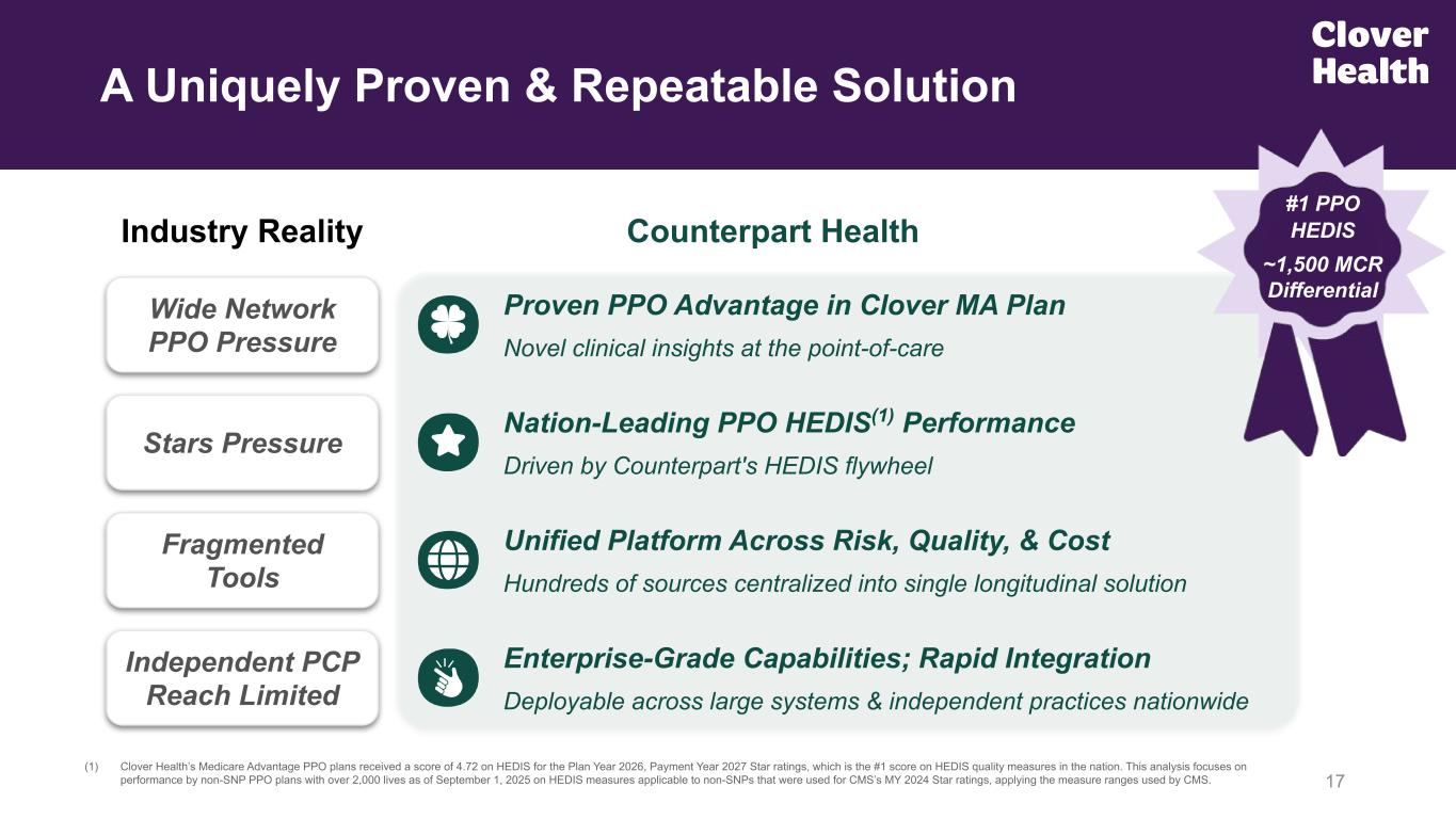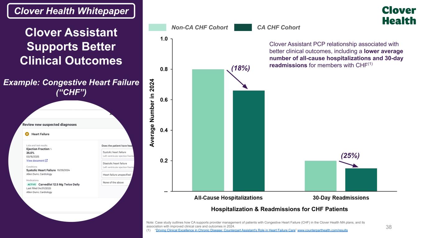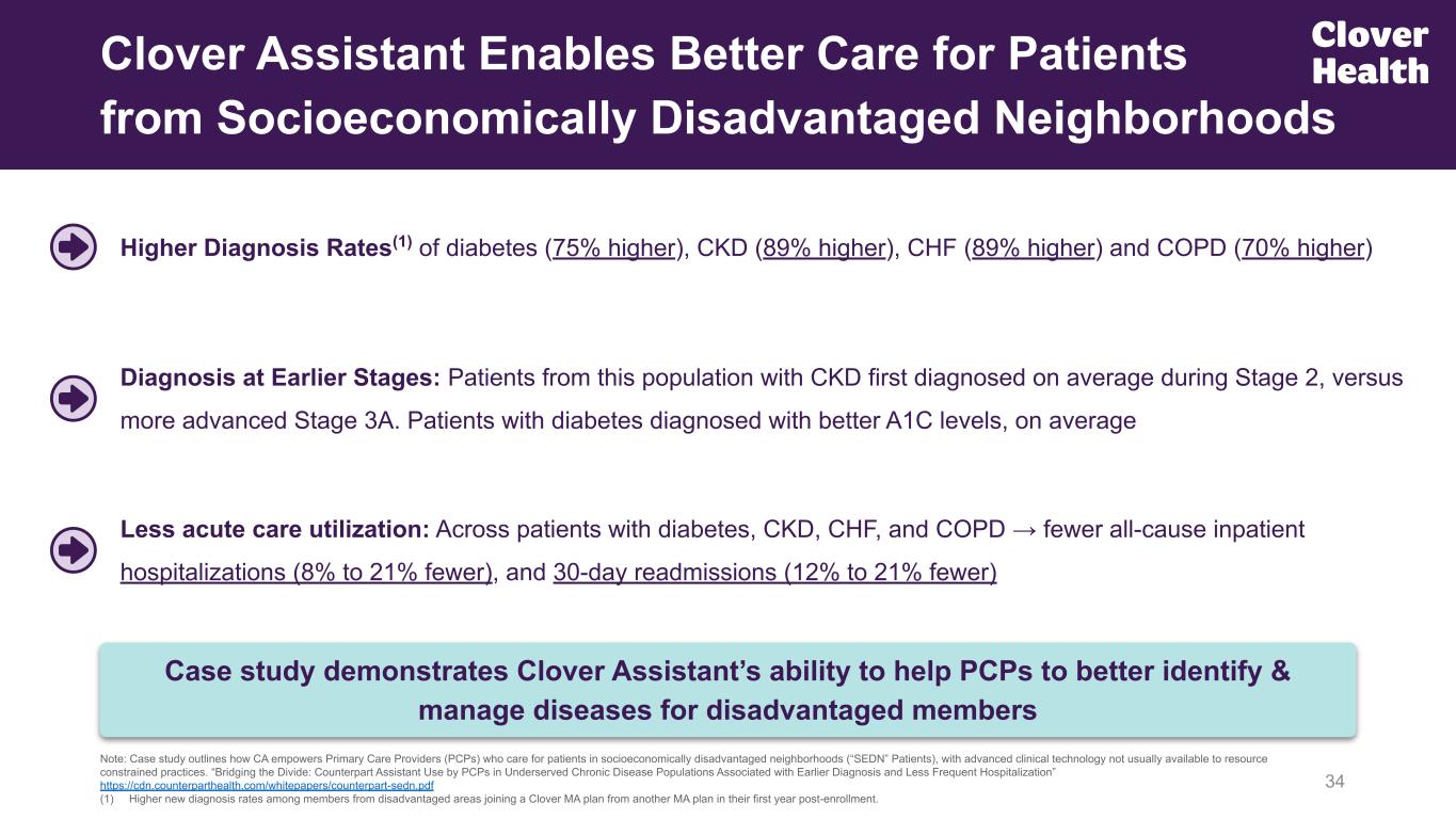 Differentiated Impact in Socioeconomically Disadvantaged: Higher diagnosis rates, earlier disease detection, and fewer all-cause inpatient hospitalizations (8% to 21% fewer), and 30-day readmissions (12% to 21% fewer) across patients with diabetes, CKD, CHF, and COPD HEDIS (Stars Measure): Use of Clover Assistant helped achieve 4.94 and 4.72 out of 5 Stars on HEDIS measures for Star Rating years 2025 and 2026, respectively, both the top-performing score on core HEDIS measures for PPO Medicare Advantage plans nationwide 33 Better Health Outcomes Across Chronic Conditions Clover Assistant Whitepapers and Case Studies(1) Diabetes: Earlier diagnosis, leading to earlier treatment (~36 months earlier on average), reduced reliance on insulin, and lower incidence of hypoglycemia Chronic Kidney Disease (CKD): Earlier diagnosis of CKD stage 3 and higher (~18 months earlier on average). Even more significant for seniors in areas of higher deprivation, including rural America, where CKD disproportionately impacts seniors Congestive Heart Failure (CHF): Lower all-cause hospitalizations (18% lower) and 30-day readmissions (25% lower) Chronic Obstructive Pulmonary Disease (COPD): Lower all-cause hospitalizations (15% lower) and 30-day readmissions (18% lower) Using proprietary AI & ML models, Clover Assistant improves care coordination for doctors and is correlated with improved patient health outcomes (1) “Clover Assistant Use and Diagnosis and Progression of Chronic Kidney Disease” www.cloverhealth.com/clinicalcare/ckd; “Clover Assistant Use and Diagnosis, Treatment, and Progression of Diabetes” www.cloverhealth.com/clinicalcare/diabetes; “Driving Clinical Excellence in Chronic Disease: Counterpart Assistant’s Role in Heart Failure Care” https://cdn.counterparthealth.com/whitepapers/2025_05_chf_whitepaper.pdf; “Counterpart Assistant Drives Clinical Excellence”, for detailed methodology and the HEDIS performance of the broader industry visit, please see here; “Driving Clinical Excellence in Chronic Disease: Counterpart Assistant’s Role in Chronic Obstructive Pulmonary Disease Care” https://cdn.counterparthealth.com/whitepapers/2025_08_copd_whitepaper.pdf; “Bridging the Divide: Counterpart Assistant Use by PCPs in Underserved Chronic Disease Populations Associated with Earlier Diagnosis and Less Frequent Hospitalization” https://cdn.counterparthealth.com/whitepapers/counterpart-sedn.pdf From 3Q25 Supp. Deck