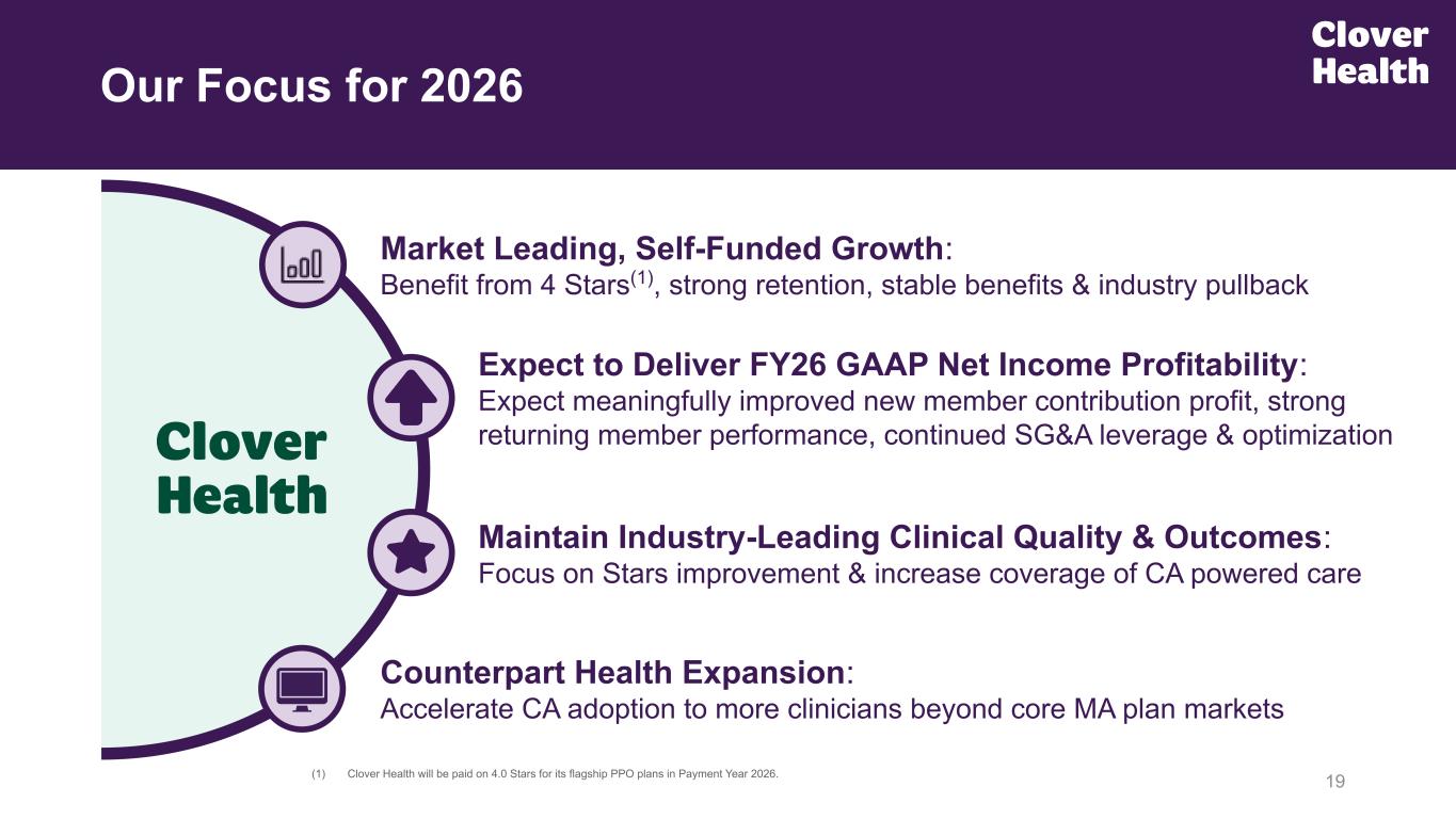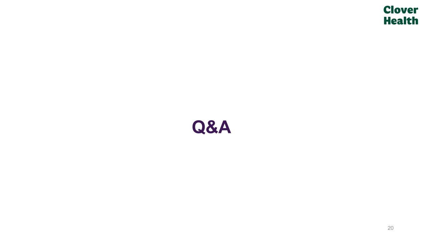 Counterpart Health Expansion: Accelerate CA adoption to more clinicians beyond core MA plan markets Expect to Deliver FY26 GAAP Net Income Profitability: Expect meaningfully improved new member contribution profit, strong returning member performance, continued SG&A leverage & optimization (1) Clover Health will be paid on 4.0 Stars for its flagship PPO plans in Payment Year 2026. Our Focus for 2026 19 Market Leading, Self-Funded Growth: Benefit from 4 Stars(1), strong retention, stable benefits & industry pullback Maintain Industry-Leading Clinical Quality & Outcomes: Focus on Stars improvement & increase coverage of CA powered care