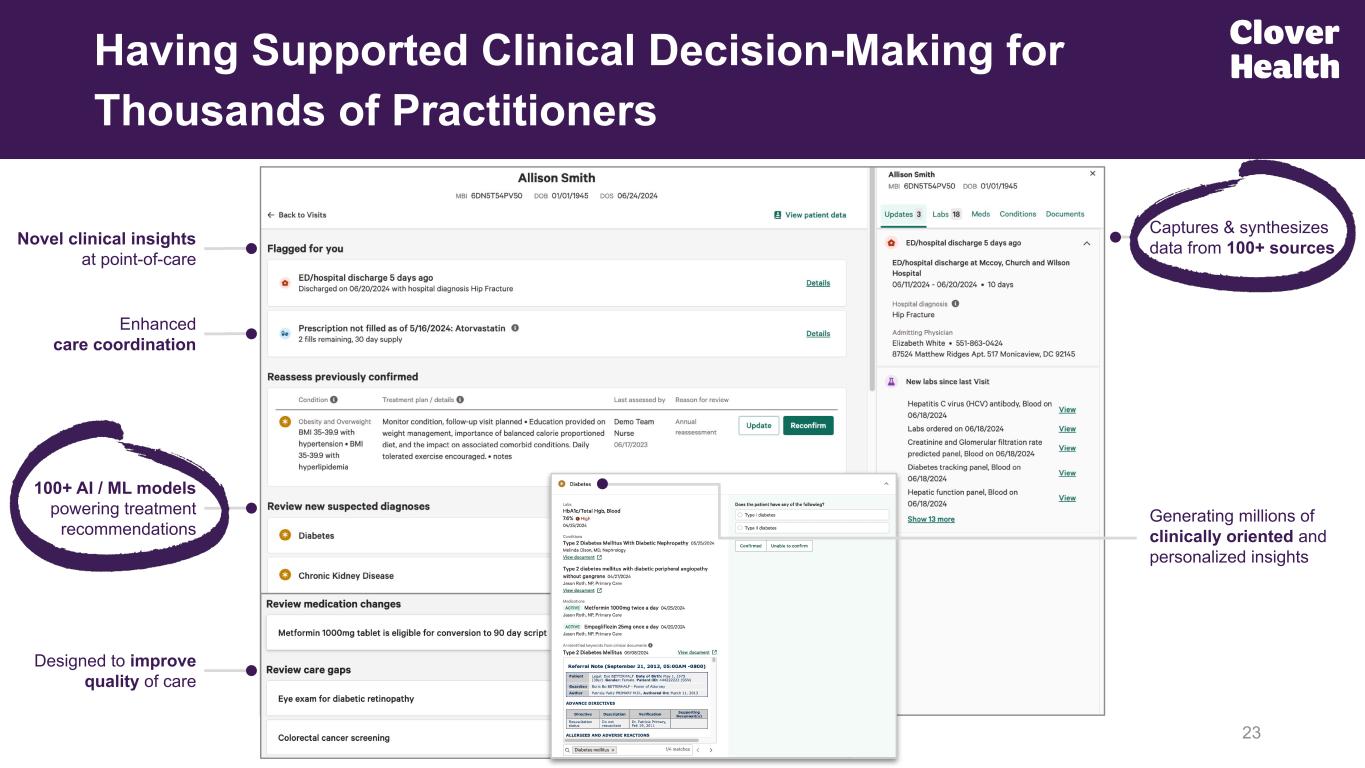 Designed to improve quality of care Having Supported Clinical Decision-Making for Thousands of Practitioners 23 Novel clinical insights at point-of-care Enhanced care coordination 100+ AI / ML models powering treatment recommendations Captures & synthesizes data from 100+ sources Generating millions of clinically oriented and personalized insights From Prior IR Deck