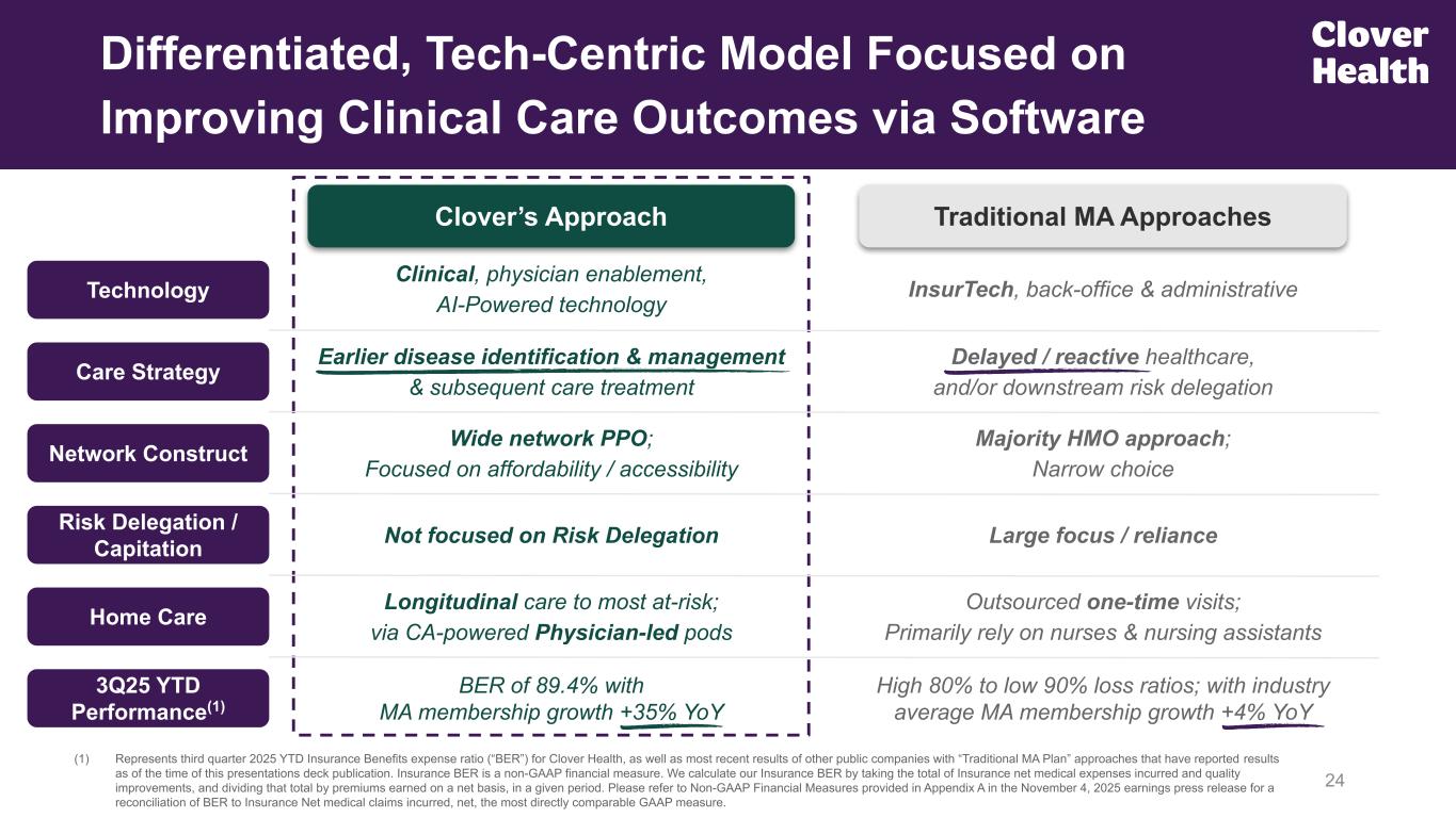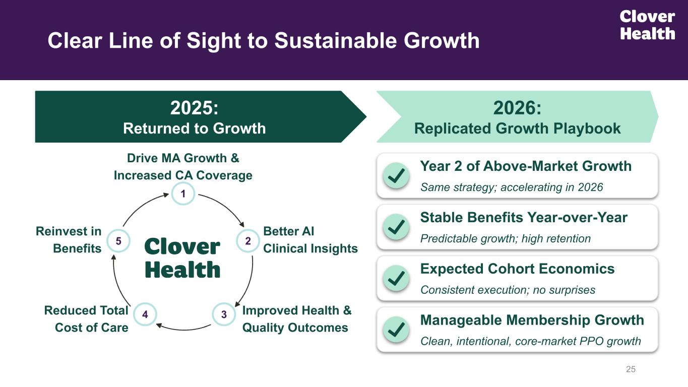 Longitudinal care to most at-risk; via CA-powered Physician-led pods Clover’s Approach Clinical, physician enablement, AI-Powered technology Earlier disease identification & management & subsequent care treatment Not focused on Risk Delegation Wide network PPO; Focused on affordability / accessibility Home Care Technology Differentiated, Tech-Centric Model Focused on Improving Clinical Care Outcomes via Software 24 Risk Delegation / Capitation Care Strategy (1) Represents third quarter 2025 YTD Insurance Benefits expense ratio (“BER”) for Clover Health, as well as most recent results of other public companies with “Traditional MA Plan” approaches that have reported results as of the time of this presentations deck publication. Insurance BER is a non-GAAP financial measure. We calculate our Insurance BER by taking the total of Insurance net medical expenses incurred and quality improvements, and dividing that total by premiums earned on a net basis, in a given period. Please refer to Non-GAAP Financial Measures provided in Appendix A in the November 4, 2025 earnings press release for a reconciliation of BER to Insurance Net medical claims incurred, net, the most directly comparable GAAP measure. Network Construct Outsourced one-time visits; Primarily rely on nurses & nursing assistants Traditional MA Approaches InsurTech, back-office & administrative Delayed / reactive healthcare, and/or downstream risk delegation Large focus / reliance Majority HMO approach; Narrow choice 3Q25 YTD Performance(1) High 80% to low 90% loss ratios; with industry average MA membership growth +4% YoY BER of 89.4% with MA membership growth +35% YoY From Prior IR Deck