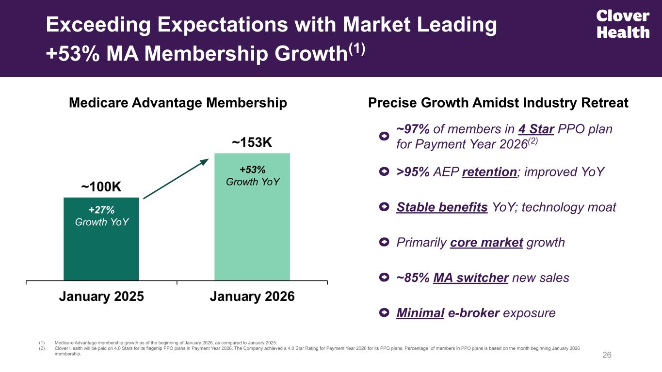 Better AI Clinical Insights 25 Clear Line of Sight to Sustainable Growth Year 2 of Above-Market Growth Same strategy; accelerating in 2026 Expected Cohort Economics Consistent execution; no surprises 2026: Replicated Growth Playbook Manageable Membership Growth Clean, intentional, core-market PPO growth Stable Benefits Year-over-Year Predictable growth; high retention 2025: Returned to Growth 2 1 34 5 Improved Health & Quality Outcomes Drive MA Growth & Increased CA Coverage Reinvest in Benefits Reduced Total Cost of Care