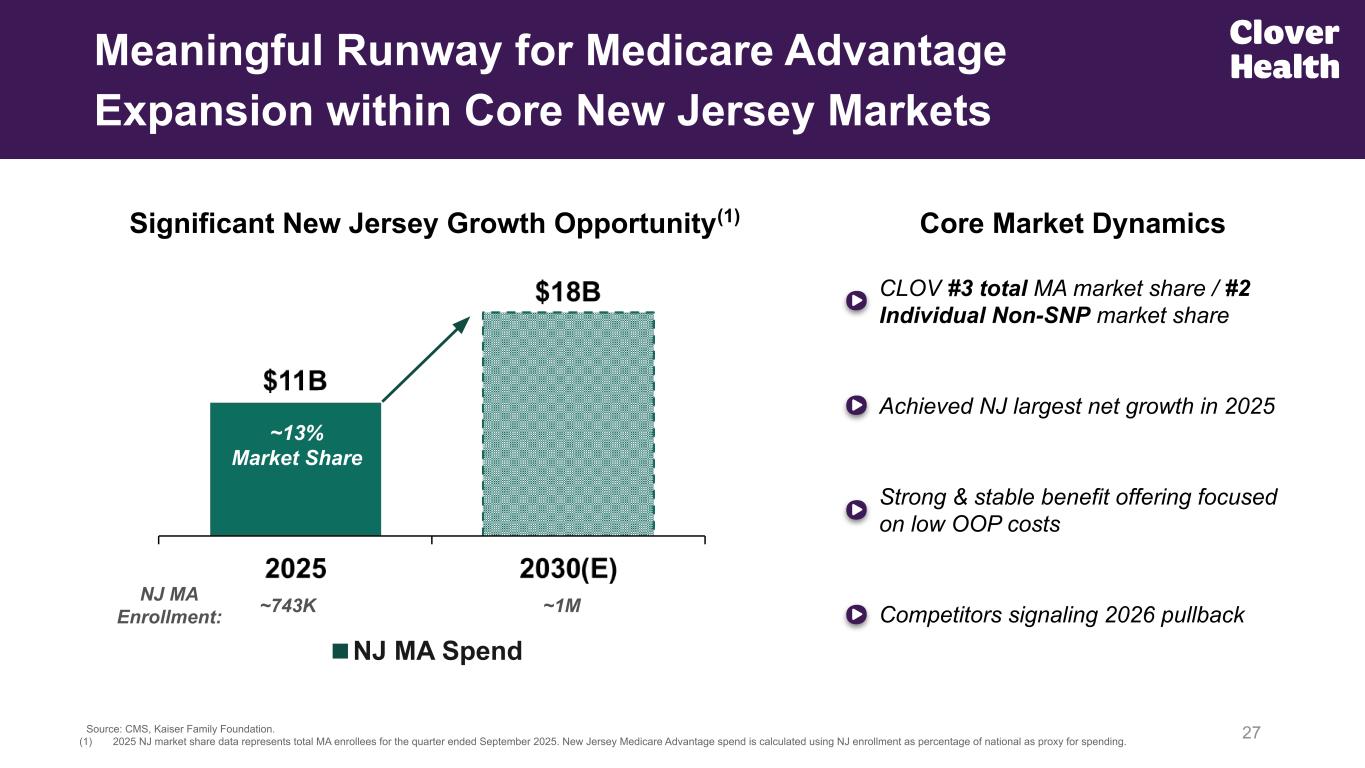 Stable benefits YoY; technology moat Precise Growth Amidst Industry Retreat 26 Medicare Advantage Membership Exceeding Expectations with Market Leading +53% MA Membership Growth(1) >95% AEP retention; improved YoY ~97% of members in 4 Star PPO plan for Payment Year 2026(2) Minimal e-broker exposure ~85% MA switcher new sales Primarily core market growth (1) Medicare Advantage membership growth as of the beginning of January 2026, as compared to January 2025. (2) Clover Health will be paid on 4.0 Stars for its flagship PPO plans in Payment Year 2026. The Company achieved a 4.0 Star Rating for Payment Year 2026 for its PPO plans. Percentage of members in PPO plans is based on the month beginning January 2026 membership. +53% Growth YoY +27% Growth YoY