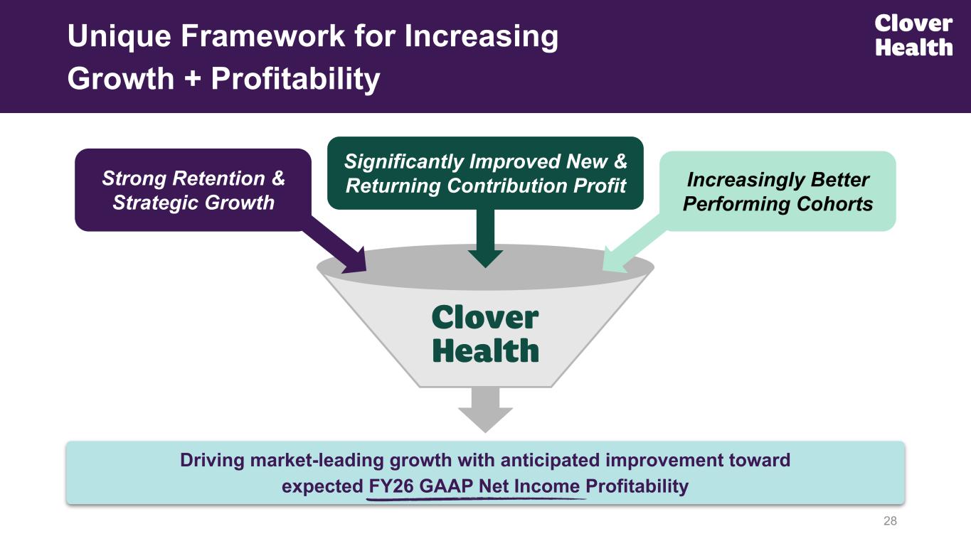 27Source: CMS, Kaiser Family Foundation. (1) 2025 NJ market share data represents total MA enrollees for the quarter ended September 2025. New Jersey Medicare Advantage spend is calculated using NJ enrollment as percentage of national as proxy for spending. Meaningful Runway for Medicare Advantage Expansion within Core New Jersey Markets Core Market Dynamics Strong & stable benefit offering focused on low OOP costs Competitors signaling 2026 pullback Achieved NJ largest net growth in 2025 CLOV #3 total MA market share / #2 Individual Non-SNP market share ~743K ~1MNJ MA Enrollment: NJ MA Spend Significant New Jersey Growth Opportunity(1) ~13% Market Share