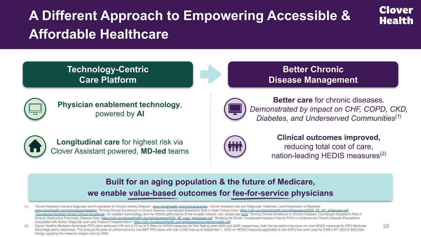 29 A Different Approach to Empowering Accessible & Affordable Healthcare Technology-Centric Care Platform Better Chronic Disease Management Built for an aging population & the future of Medicare, we enable value-based outcomes for fee-for-service physicians Physician enablement technology, powered by AI Longitudinal care for highest risk via Clover Assistant powered, MD-led teams Clinical outcomes improved, reducing total cost of care, nation-leading HEDIS measures(2) Better care for chronic diseases. Demonstrated by impact on CHF, COPD, CKD, Diabetes, and Underserved Communities(1) (1) “Clover Assistant Use and Diagnosis and Progression of Chronic Kidney Disease” www.cloverhealth.com/clinicalcare/ckd; “Clover Assistant Use and Diagnosis, Treatment, and Progression of Diabetes” www.cloverhealth.com/clinicalcare/diabetes; “Driving Clinical Excellence in Chronic Disease: Counterpart Assistant’s Role in Heart Failure Care” https://cdn.counterparthealth.com/whitepapers/2025_05_chf_whitepaper.pdf; “Counterpart Assistant Drives Clinical Excellence”, for detailed methodology and the HEDIS performance of the broader industry visit, please see here; “Driving Clinical Excellence in Chronic Disease: Counterpart Assistant’s Role in Chronic Obstructive Pulmonary Disease Care” https://cdn.counterparthealth.com/whitepapers/2025_08_copd_whitepaper.pdf; “Bridging the Divide: Counterpart Assistant Use by PCPs in Underserved Chronic Disease Populations Associated with Earlier Diagnosis and Less Frequent Hospitalization” https://cdn.counterparthealth.com/whitepapers/counterpart-sedn.pdf (2) Clover Health’s Medicare Advantage PPO plans achieved 4.94 and 4.72 out of 5 Stars on HEDIS measures for Star Rating years 2025 and 2026, respectively, both the top-performing score on core HEDIS measures for PPO Medicare Advantage plans nationwide. This analysis focuses on performance by non-SNP PPO plans with over 2,000 lives as of September 1, 2025 on HEDIS measures applicable to non-SNPs that were used for CMS’s MY 2023 & 2024 Star ratings, applying the measure ranges used by CMS. From Prior IR Deck