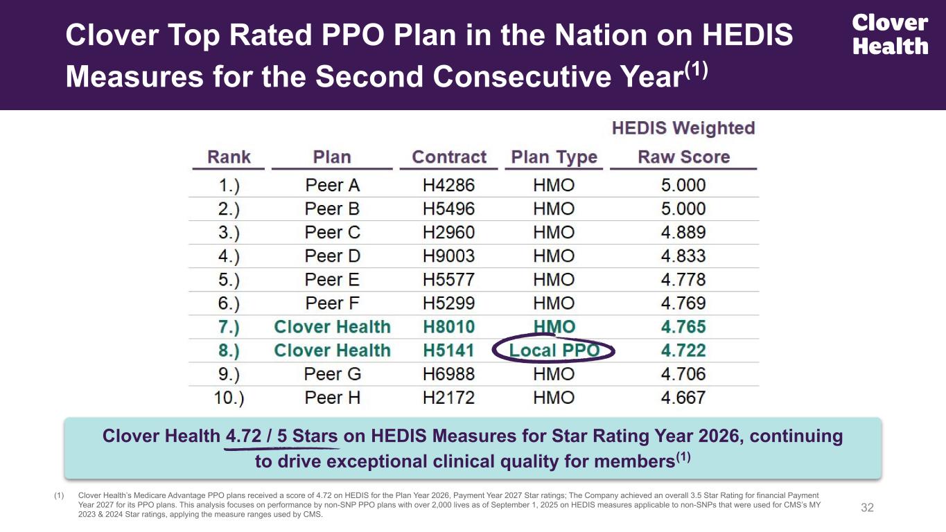Clover Home Care Cohort has Significantly Improved MCR from 2021 to 2024(1) Care Platform: Differentiated Home Care at Critical Moments Higher Disease Acuity Lower Disease Acuity Clover Assistant Powered Network PCPs Care Intensity (1) Our data shows that since 2021, MCRs for members enrolled in our In-Home Care program (highest acuity population) have decreased over a 3 year period. Longitudinal, MD-led, primary care in the home for highest acuity population Readmission prevention and post-acute Assessment visits for unknown / emerging risk Clover Home Care 31 From Prior IR Deck
