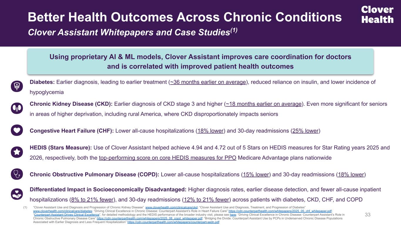 Clover Health 4.72 / 5 Stars on HEDIS Measures for Star Rating Year 2026, continuing to drive exceptional clinical quality for members(1) 32 (1) Clover Health’s Medicare Advantage PPO plans received a score of 4.72 on HEDIS for the Plan Year 2026, Payment Year 2027 Star ratings; The Company achieved an overall 3.5 Star Rating for financial Payment Year 2027 for its PPO plans. This analysis focuses on performance by non-SNP PPO plans with over 2,000 lives as of September 1, 2025 on HEDIS measures applicable to non-SNPs that were used for CMS’s MY 2023 & 2024 Star ratings, applying the measure ranges used by CMS. Clover Top Rated PPO Plan in the Nation on HEDIS Measures for the Second Consecutive Year(1) From 3Q25 Supp. Deck