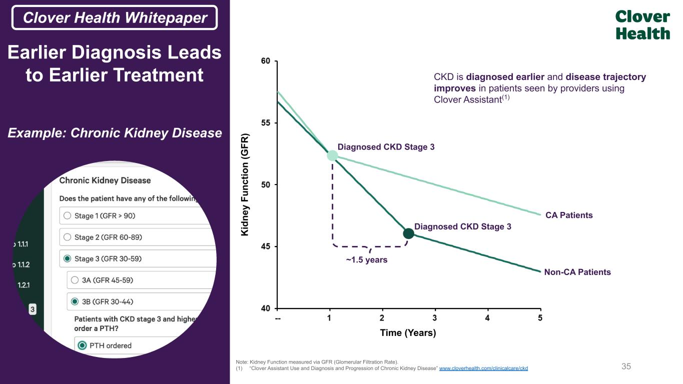 Note: Case study outlines how CA empowers Primary Care Providers (PCPs) who care for patients in socioeconomically disadvantaged neighborhoods (“SEDN” Patients), with advanced clinical technology not usually available to resource constrained practices. “Bridging the Divide: Counterpart Assistant Use by PCPs in Underserved Chronic Disease Populations Associated with Earlier Diagnosis and Less Frequent Hospitalization” https://cdn.counterparthealth.com/whitepapers/counterpart-sedn.pdf (1) Higher new diagnosis rates among members from disadvantaged areas joining a Clover MA plan from another MA plan in their first year post-enrollment. Less acute care utilization: Across patients with diabetes, CKD, CHF, and COPD → fewer all-cause inpatient hospitalizations (8% to 21% fewer), and 30-day readmissions (12% to 21% fewer) Diagnosis at Earlier Stages: Patients from this population with CKD first diagnosed on average during Stage 2, versus more advanced Stage 3A. Patients with diabetes diagnosed with better A1C levels, on average Higher Diagnosis Rates(1) of diabetes (75% higher), CKD (89% higher), CHF (89% higher) and COPD (70% higher) Clover Assistant Enables Better Care for Patients from Socioeconomically Disadvantaged Neighborhoods 34 Case study demonstrates Clover Assistant’s ability to help PCPs to better identify & manage diseases for disadvantaged members From 3Q25 Supp. Deck