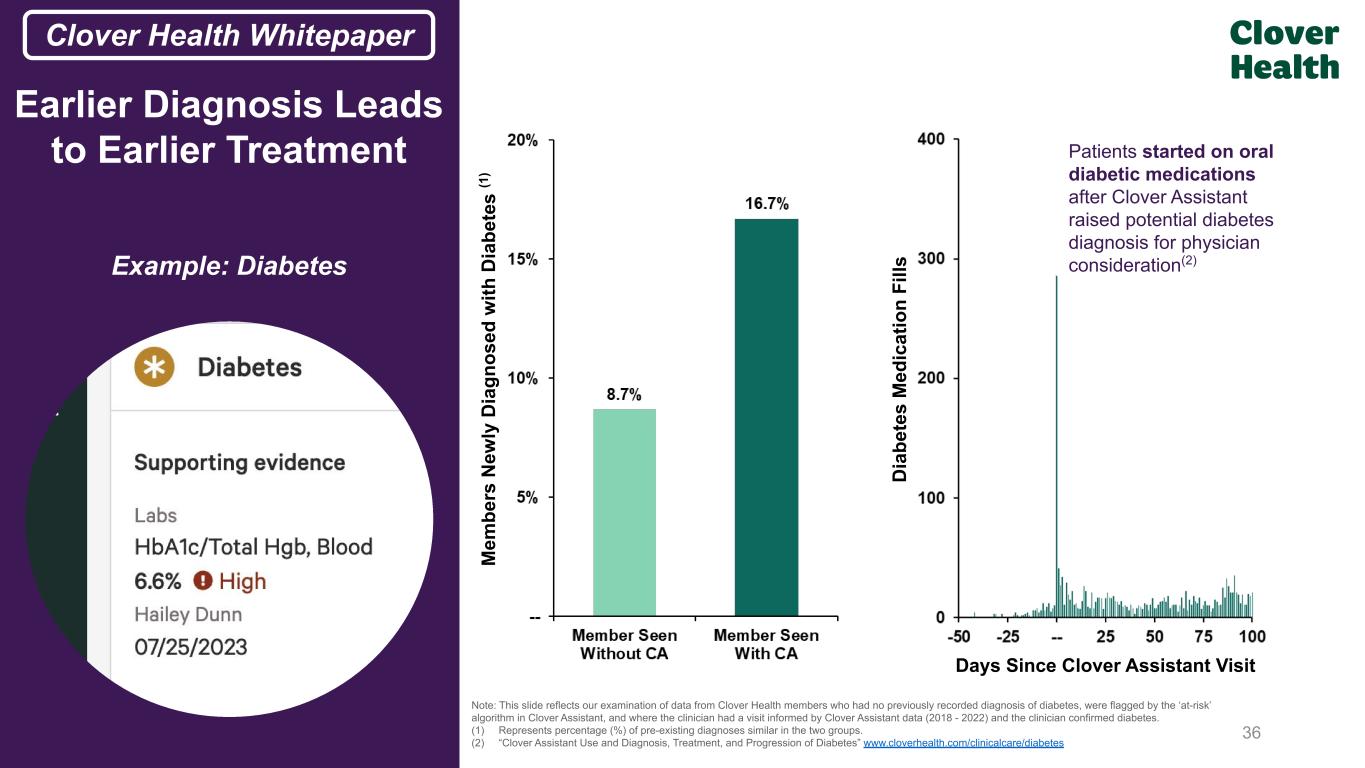 Note: Kidney Function measured via GFR (Glomerular Filtration Rate). (1) “Clover Assistant Use and Diagnosis and Progression of Chronic Kidney Disease” www.cloverhealth.com/clinicalcare/ckd Earlier Diagnosis Leads to Earlier Treatment Example: Chronic Kidney Disease ~1.5 years CA Patients Non-CA Patients Diagnosed CKD Stage 3 Diagnosed CKD Stage 3 Time (Years) CKD is diagnosed earlier and disease trajectory improves in patients seen by providers using Clover Assistant(1) K id ne y Fu nc tio n (G FR ) 35 From Prior IR Deck Clover Health Whitepaper