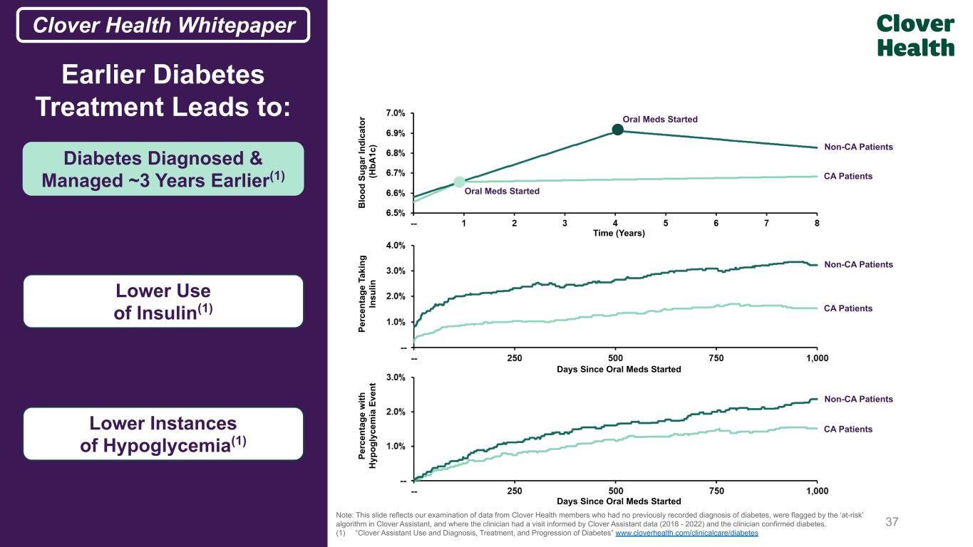 Note: This slide reflects our examination of data from Clover Health members who had no previously recorded diagnosis of diabetes, were flagged by the ‘at-risk’ algorithm in Clover Assistant, and where the clinician had a visit informed by Clover Assistant data (2018 - 2022) and the clinician confirmed diabetes. (1) Represents percentage (%) of pre-existing diagnoses similar in the two groups. (2) “Clover Assistant Use and Diagnosis, Treatment, and Progression of Diabetes” www.cloverhealth.com/clinicalcare/diabetes Days Since Clover Assistant Visit M em be rs N ew ly D ia gn os ed w ith D ia be te s (1 ) Earlier Diagnosis Leads to Earlier Treatment Example: Diabetes Patients started on oral diabetic medications after Clover Assistant raised potential diabetes diagnosis for physician consideration(2) D ia be te s M ed ic at io n Fi lls 36 Clover Health WhitepaperFrom Prior IR Deck