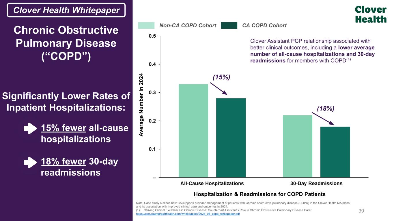 Av er ag e N um be r i n 20 24 Clover Assistant Supports Better Clinical Outcomes Example: Congestive Heart Failure (“CHF”) 38 Clover Assistant PCP relationship associated with better clinical outcomes, including a lower average number of all-cause hospitalizations and 30-day readmissions for members with CHF(1) (25%) (18%) CA CHF Cohort Non-CA CHF Cohort Hospitalization & Readmissions for CHF Patients Note: Case study outlines how CA supports provider management of patients with Congestive Heart Failure (CHF) in the Clover Health MA plans, and its association with improved clinical care and outcomes in 2024. (1) “Driving Clinical Excellence in Chronic Disease: Counterpart Assistant's Role in Heart Failure Care” www.counterparthealth.com/results Clover Health WhitepaperFrom Prior IR Deck