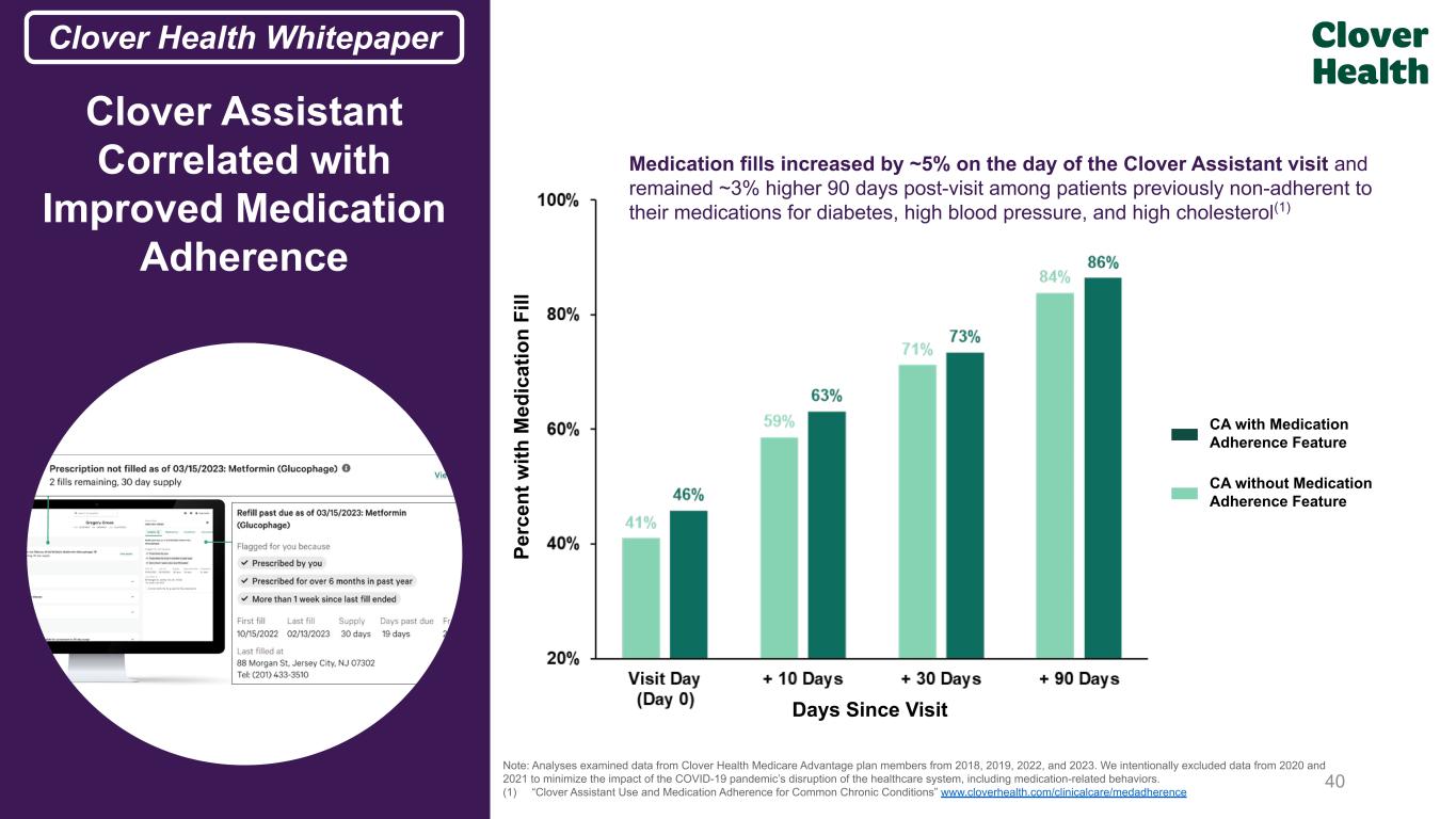 Medication fills increased by ~5% on the day of the Clover Assistant visit and remained ~3% higher 90 days post-visit among patients previously non-adherent to their medications for diabetes, high blood pressure, and high cholesterol(1) Days Since Visit Note: Analyses examined data from Clover Health Medicare Advantage plan members from 2018, 2019, 2022, and 2023. We intentionally excluded data from 2020 and 2021 to minimize the impact of the COVID-19 pandemic’s disruption of the healthcare system, including medication-related behaviors. (1) “Clover Assistant Use and Medication Adherence for Common Chronic Conditions” www.cloverhealth.com/clinicalcare/medadherence Pe rc en t w ith M ed ic at io n Fi ll Clover Assistant Correlated with Improved Medication Adherence CA with Medication Adherence Feature CA without Medication Adherence Feature 40 Clover Health WhitepaperFrom Prior IR Deck