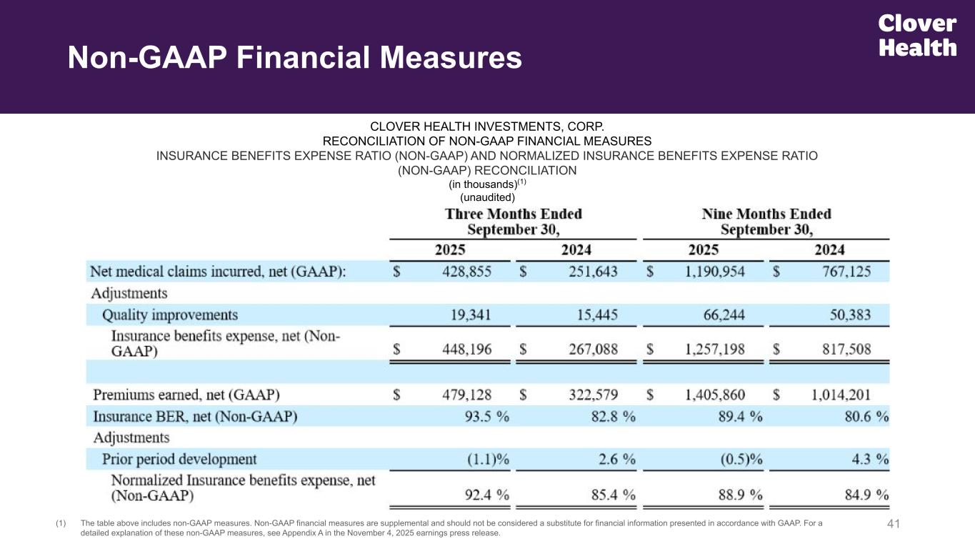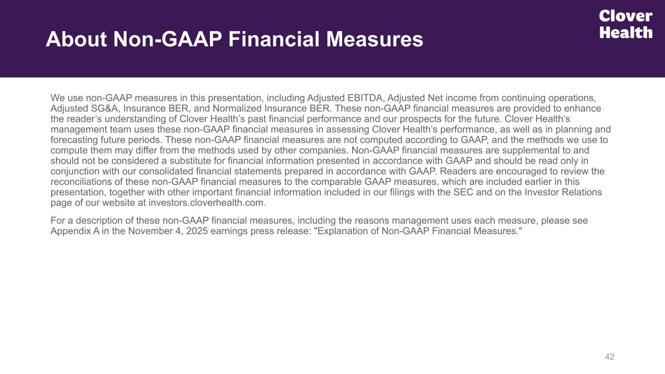 41(1) The table above includes non-GAAP measures. Non-GAAP financial measures are supplemental and should not be considered a substitute for financial information presented in accordance with GAAP. For a detailed explanation of these non-GAAP measures, see Appendix A in the November 4, 2025 earnings press release. CLOVER HEALTH INVESTMENTS, CORP. RECONCILIATION OF NON-GAAP FINANCIAL MEASURES INSURANCE BENEFITS EXPENSE RATIO (NON-GAAP) AND NORMALIZED INSURANCE BENEFITS EXPENSE RATIO (NON-GAAP) RECONCILIATION (in thousands)(1) (unaudited) Non-GAAP Financial Measures From 3Q25 Supp. Deck