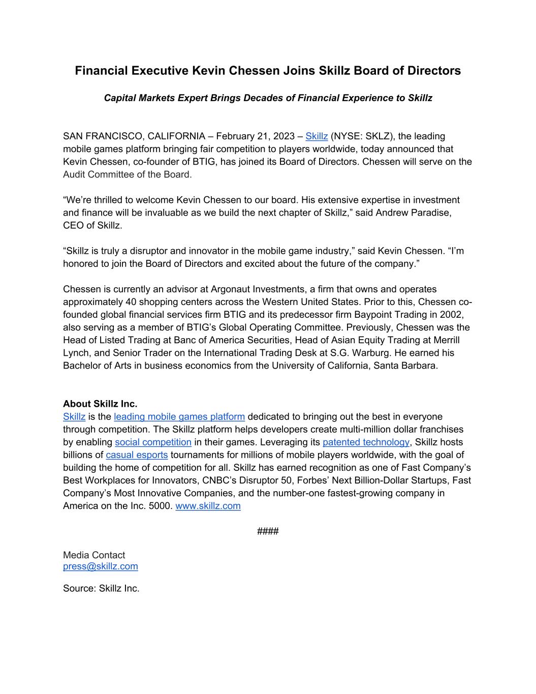 Financial Executive Kevin Chessen Joins Skillz Board of Directors Capital Markets Expert Brings Decades of Financial Experience to Skillz SAN FRANCISCO, CALIFORNIA – February 21, 2023 – Skillz (NYSE: SKLZ), the leading mobile games platform bringing fair competition to players worldwide, today announced that Kevin Chessen, co-founder of BTIG, has joined its Board of Directors. Chessen will serve on the Audit Committee of the Board. “We’re thrilled to welcome Kevin Chessen to our board. His extensive expertise in investment and finance will be invaluable as we build the next chapter of Skillz,” said Andrew Paradise, CEO of Skillz. “Skillz is truly a disruptor and innovator in the mobile game industry,” said Kevin Chessen. “I’m honored to join the Board of Directors and excited about the future of the company.” Chessen is currently an advisor at Argonaut Investments, a firm that owns and operates approximately 40 shopping centers across the Western United States. Prior to this, Chessen co- founded global financial services firm BTIG and its predecessor firm Baypoint Trading in 2002, also serving as a member of BTIG’s Global Operating Committee. Previously, Chessen was the Head of Listed Trading at Banc of America Securities, Head of Asian Equity Trading at Merrill Lynch, and Senior Trader on the International Trading Desk at S.G. Warburg. He earned his Bachelor of Arts in business economics from the University of California, Santa Barbara. About Skillz Inc. Skillz is the leading mobile games platform dedicated to bringing out the best in everyone through competition. The Skillz platform helps developers create multi-million dollar franchises by enabling social competition in their games. Leveraging its patented technology, Skillz hosts billions of casual esports tournaments for millions of mobile players worldwide, with the goal of building the home of competition for all. Skillz has earned recognition as one of Fast Company’s Best Workplaces for Innovators, CNBC’s Disruptor 50, Forbes’ Next Billion-Dollar Startups, Fast Company’s Most Innovative Companies, and the number-one fastest-growing company in America on the Inc. 5000. www.skillz.com #### Media Contact press@skillz.com Source: Skillz Inc.