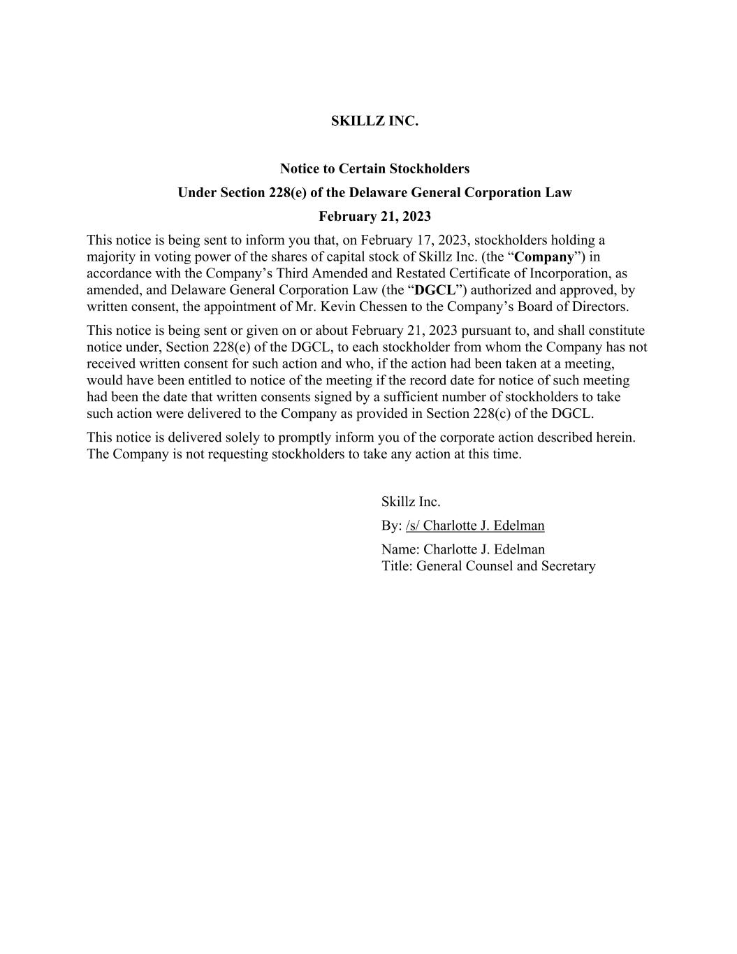 SKILLZ INC. Notice to Certain Stockholders Under Section 228(e) of the Delaware General Corporation Law February 21, 2023 This notice is being sent to inform you that, on February 17, 2023, stockholders holding a majority in voting power of the shares of capital stock of Skillz Inc. (the “Company”) in accordance with the Company’s Third Amended and Restated Certificate of Incorporation, as amended, and Delaware General Corporation Law (the “DGCL”) authorized and approved, by written consent, the appointment of Mr. Kevin Chessen to the Company’s Board of Directors. This notice is being sent or given on or about February 21, 2023 pursuant to, and shall constitute notice under, Section 228(e) of the DGCL, to each stockholder from whom the Company has not received written consent for such action and who, if the action had been taken at a meeting, would have been entitled to notice of the meeting if the record date for notice of such meeting had been the date that written consents signed by a sufficient number of stockholders to take such action were delivered to the Company as provided in Section 228(c) of the DGCL. This notice is delivered solely to promptly inform you of the corporate action described herein. The Company is not requesting stockholders to take any action at this time. Skillz Inc. By: /s/ Charlotte J. Edelman Name: Charlotte J. Edelman Title: General Counsel and Secretary