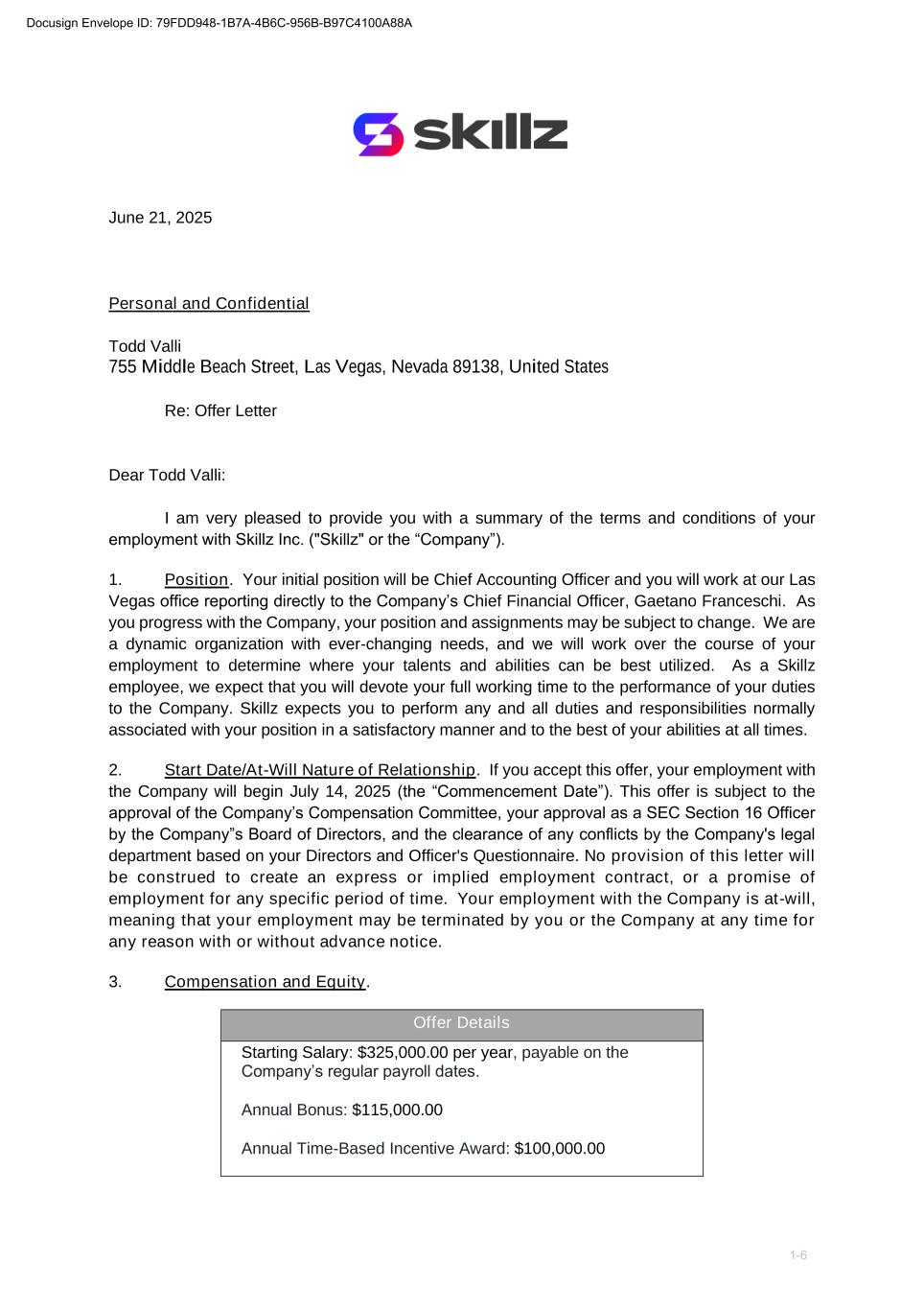 1-6 June 21, 2025 Personal and Confidential Todd Valli 755 Middle Beach Street, Las Vegas, Nevada 89138, United States Re: Offer Letter Dear Todd Valli: I am very pleased to provide you with a summary of the terms and conditions of your employment with Skillz Inc. ("Skillz" or the “Company”). 1. Position. Your initial position will be Chief Accounting Officer and you will work at our Las Vegas office reporting directly to the Company’s Chief Financial Officer, Gaetano Franceschi. As you progress with the Company, your position and assignments may be subject to change. We are a dynamic organization with ever-changing needs, and we will work over the course of your employment to determine where your talents and abilities can be best utilized. As a Skillz employee, we expect that you will devote your full working time to the performance of your duties to the Company. Skillz expects you to perform any and all duties and responsibilities normally associated with your position in a satisfactory manner and to the best of your abilities at all times. 2. Start Date/At-Will Nature of Relationship. If you accept this offer, your employment with the Company will begin July 14, 2025 (the “Commencement Date”). This offer is subject to the approval of the Company’s Compensation Committee, your approval as a SEC Section 16 Officer by the Company”s Board of Directors, and the clearance of any conflicts by the Company's legal department based on your Directors and Officer's Questionnaire. No provision of this letter will be construed to create an express or implied employment contract, or a promise of employment for any specific period of time. Your employment with the Company is at-will, meaning that your employment may be terminated by you or the Company at any time for any reason with or without advance notice. 3. Compensation and Equity. Offer Details • Starting Salary: $325,000.00 per year, payable on the Company’s regular payroll dates. • Annual Bonus: $115,000.00 • Annual Time-Based Incentive Award: $100,000.00 Docusign Envelope ID: 79FDD948-1B7A-4B6C-956B-B97C4100A88A
