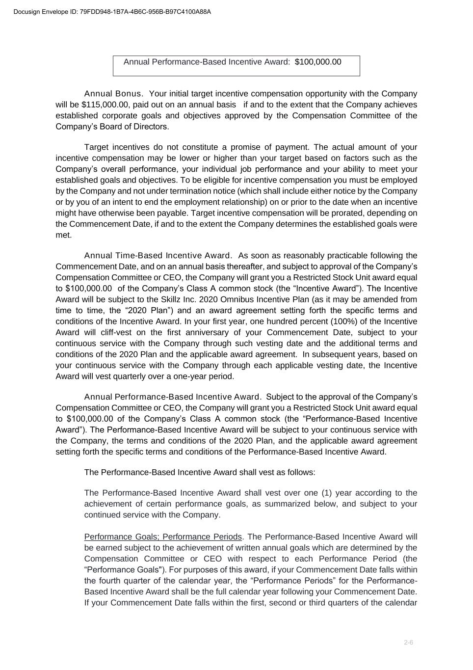 2-6 • Annual Performance-Based Incentive Award: $100,000.00 Annual Bonus. Your initial target incentive compensation opportunity with the Company will be $115,000.00, paid out on an annual basis if and to the extent that the Company achieves established corporate goals and objectives approved by the Compensation Committee of the Company’s Board of Directors. Target incentives do not constitute a promise of payment. The actual amount of your incentive compensation may be lower or higher than your target based on factors such as the Company’s overall performance, your individual job performance and your ability to meet your established goals and objectives. To be eligible for incentive compensation you must be employed by the Company and not under termination notice (which shall include either notice by the Company or by you of an intent to end the employment relationship) on or prior to the date when an incentive might have otherwise been payable. Target incentive compensation will be prorated, depending on the Commencement Date, if and to the extent the Company determines the established goals were met. Annual Time-Based Incentive Award. As soon as reasonably practicable following the Commencement Date, and on an annual basis thereafter, and subject to approval of the Company’s Compensation Committee or CEO, the Company will grant you a Restricted Stock Unit award equal to $100,000.00 of the Company’s Class A common stock (the “Incentive Award”). The Incentive Award will be subject to the Skillz Inc. 2020 Omnibus Incentive Plan (as it may be amended from time to time, the “2020 Plan”) and an award agreement setting forth the specific terms and conditions of the Incentive Award. In your first year, one hundred percent (100%) of the Incentive Award will cliff-vest on the first anniversary of your Commencement Date, subject to your continuous service with the Company through such vesting date and the additional terms and conditions of the 2020 Plan and the applicable award agreement. In subsequent years, based on your continuous service with the Company through each applicable vesting date, the Incentive Award will vest quarterly over a one-year period. Annual Performance-Based Incentive Award. Subject to the approval of the Company’s Compensation Committee or CEO, the Company will grant you a Restricted Stock Unit award equal to $100,000.00 of the Company’s Class A common stock (the “Performance-Based Incentive Award”). The Performance-Based Incentive Award will be subject to your continuous service with the Company, the terms and conditions of the 2020 Plan, and the applicable award agreement setting forth the specific terms and conditions of the Performance-Based Incentive Award. The Performance-Based Incentive Award shall vest as follows: The Performance-Based Incentive Award shall vest over one (1) year according to the achievement of certain performance goals, as summarized below, and subject to your continued service with the Company. Performance Goals; Performance Periods. The Performance-Based Incentive Award will be earned subject to the achievement of written annual goals which are determined by the Compensation Committee or CEO with respect to each Performance Period (the “Performance Goals"). For purposes of this award, if your Commencement Date falls within the fourth quarter of the calendar year, the “Performance Periods” for the Performance- Based Incentive Award shall be the full calendar year following your Commencement Date. If your Commencement Date falls within the first, second or third quarters of the calendar Docusign Envelope ID: 79FDD948-1B7A-4B6C-956B-B97C4100A88A