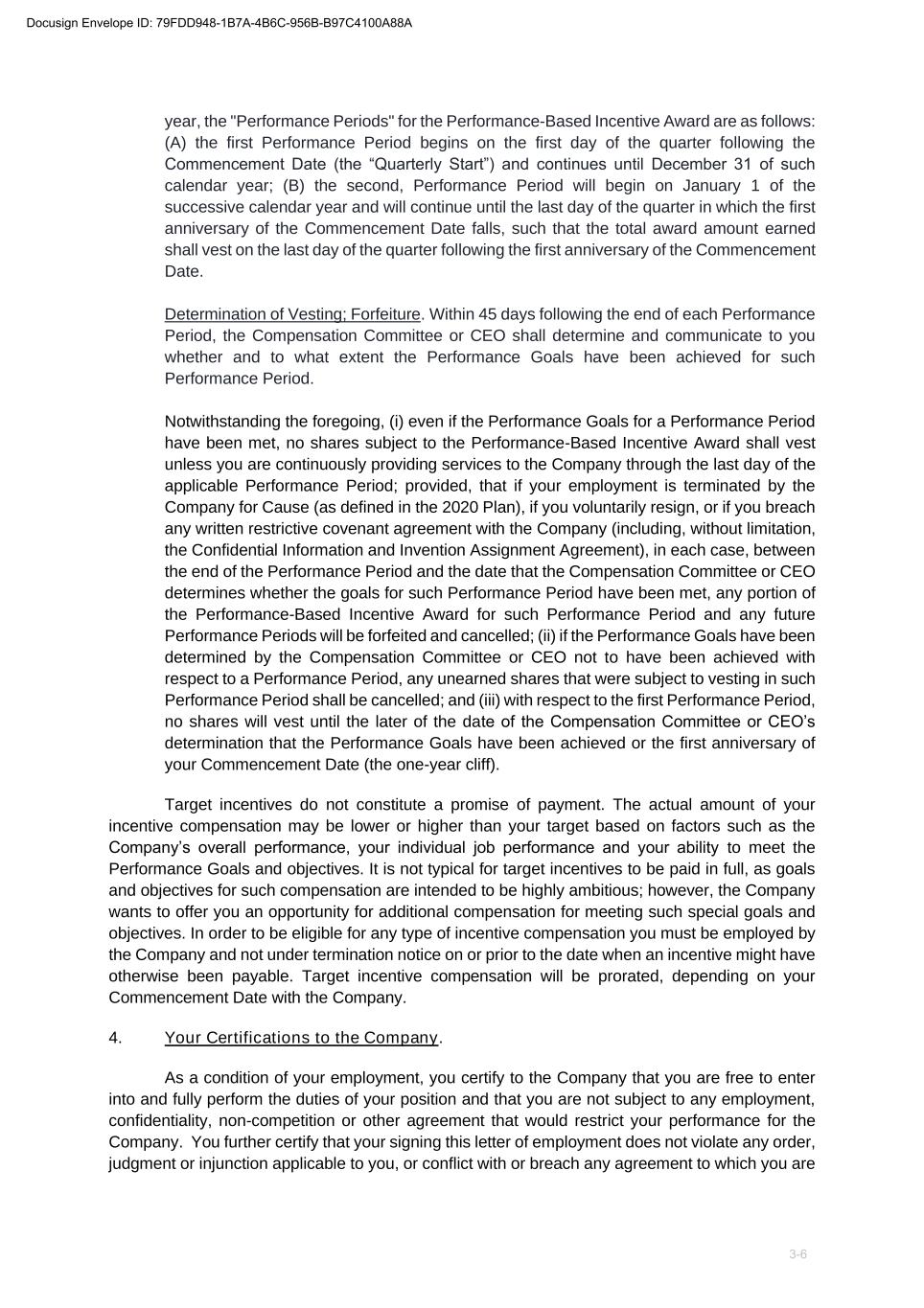 3-6 year, the "Performance Periods" for the Performance-Based Incentive Award are as follows: (A) the first Performance Period begins on the first day of the quarter following the Commencement Date (the “Quarterly Start”) and continues until December 31 of such calendar year; (B) the second, Performance Period will begin on January 1 of the successive calendar year and will continue until the last day of the quarter in which the first anniversary of the Commencement Date falls, such that the total award amount earned shall vest on the last day of the quarter following the first anniversary of the Commencement Date. Determination of Vesting; Forfeiture. Within 45 days following the end of each Performance Period, the Compensation Committee or CEO shall determine and communicate to you whether and to what extent the Performance Goals have been achieved for such Performance Period. Notwithstanding the foregoing, (i) even if the Performance Goals for a Performance Period have been met, no shares subject to the Performance-Based Incentive Award shall vest unless you are continuously providing services to the Company through the last day of the applicable Performance Period; provided, that if your employment is terminated by the Company for Cause (as defined in the 2020 Plan), if you voluntarily resign, or if you breach any written restrictive covenant agreement with the Company (including, without limitation, the Confidential Information and Invention Assignment Agreement), in each case, between the end of the Performance Period and the date that the Compensation Committee or CEO determines whether the goals for such Performance Period have been met, any portion of the Performance-Based Incentive Award for such Performance Period and any future Performance Periods will be forfeited and cancelled; (ii) if the Performance Goals have been determined by the Compensation Committee or CEO not to have been achieved with respect to a Performance Period, any unearned shares that were subject to vesting in such Performance Period shall be cancelled; and (iii) with respect to the first Performance Period, no shares will vest until the later of the date of the Compensation Committee or CEO’s determination that the Performance Goals have been achieved or the first anniversary of your Commencement Date (the one-year cliff). Target incentives do not constitute a promise of payment. The actual amount of your incentive compensation may be lower or higher than your target based on factors such as the Company’s overall performance, your individual job performance and your ability to meet the Performance Goals and objectives. It is not typical for target incentives to be paid in full, as goals and objectives for such compensation are intended to be highly ambitious; however, the Company wants to offer you an opportunity for additional compensation for meeting such special goals and objectives. In order to be eligible for any type of incentive compensation you must be employed by the Company and not under termination notice on or prior to the date when an incentive might have otherwise been payable. Target incentive compensation will be prorated, depending on your Commencement Date with the Company. 4. Your Certifications to the Company. As a condition of your employment, you certify to the Company that you are free to enter into and fully perform the duties of your position and that you are not subject to any employment, confidentiality, non-competition or other agreement that would restrict your performance for the Company. You further certify that your signing this letter of employment does not violate any order, judgment or injunction applicable to you, or conflict with or breach any agreement to which you are Docusign Envelope ID: 79FDD948-1B7A-4B6C-956B-B97C4100A88A