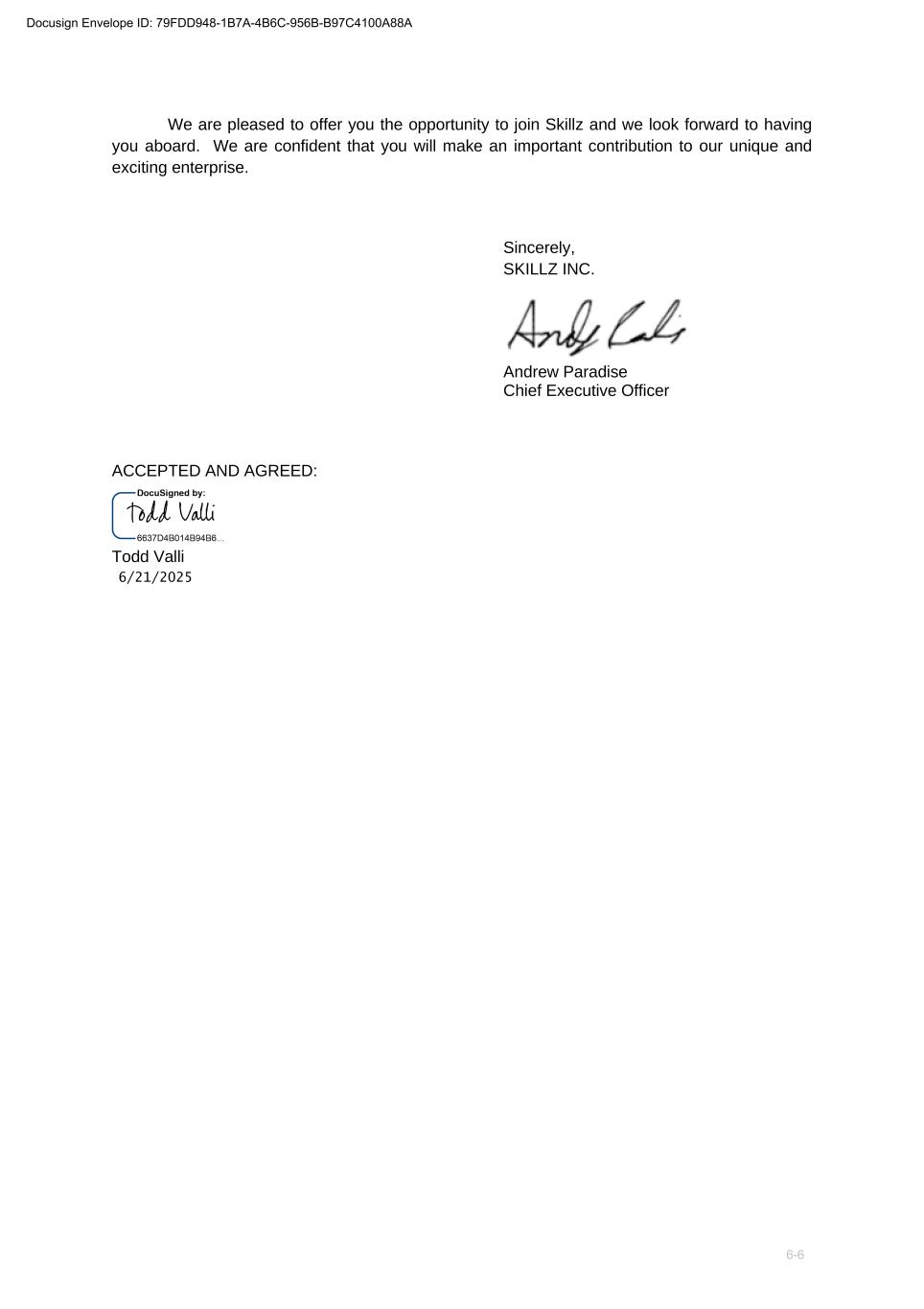 6-6 We are pleased to offer you the opportunity to join Skillz and we look forward to having you aboard. We are confident that you will make an important contribution to our unique and exciting enterprise. Sincerely, SKILLZ INC. Andrew Paradise Chief Executive Officer ACCEPTED AND AGREED: [0nnidkh_____________________] Todd Valli [hgypg46_________] Docusign Envelope ID: 79FDD948-1B7A-4B6C-956B-B97C4100A88A 6/21/2025