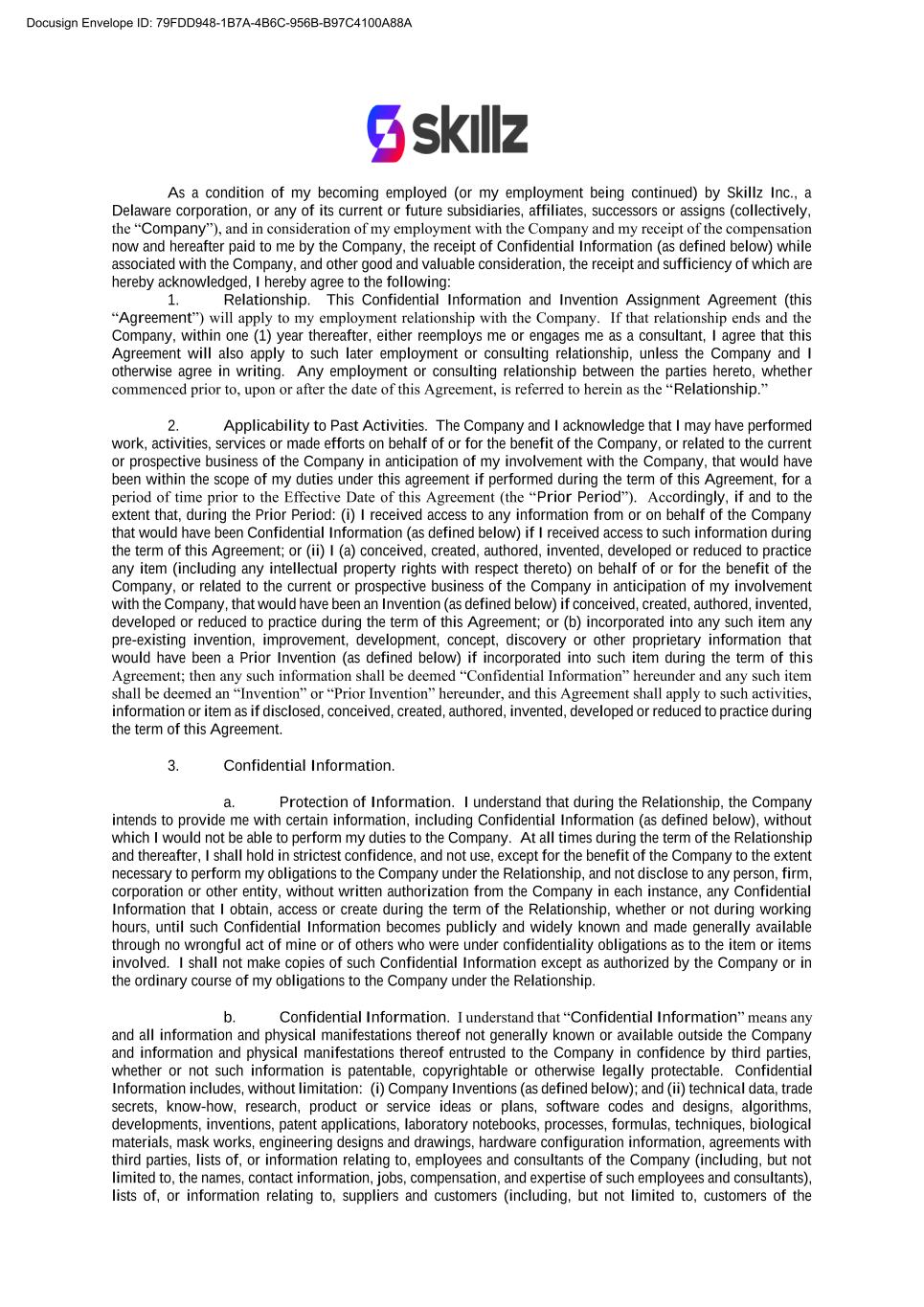 As a condition of my becoming employed (or my employment being continued) by Skillz Inc., a Delaware corporation, or any of its current or future subsidiaries, affiliates, successors or assigns (collectively, the “Company”), and in consideration of my employment with the Company and my receipt of the compensation now and hereafter paid to me by the Company, the receipt of Confidential Information (as defined below) while associated with the Company, and other good and valuable consideration, the receipt and sufficiency of which are hereby acknowledged, I hereby agree to the following: 1. Relationship. This Confidential Information and Invention Assignment Agreement (this “Agreement”) will apply to my employment relationship with the Company. If that relationship ends and the Company, within one (1) year thereafter, either reemploys me or engages me as a consultant, I agree that this Agreement will also apply to such later employment or consulting relationship, unless the Company and I otherwise agree in writing. Any employment or consulting relationship between the parties hereto, whether commenced prior to, upon or after the date of this Agreement, is referred to herein as the “Relationship.” 2. Applicability to Past Activities. The Company and I acknowledge that I may have performed work, activities, services or made efforts on behalf of or for the benefit of the Company, or related to the current or prospective business of the Company in anticipation of my involvement with the Company, that would have been within the scope of my duties under this agreement if performed during the term of this Agreement, for a period of time prior to the Effective Date of this Agreement (the “Prior Period”). Accordingly, if and to the extent that, during the Prior Period: (i) I received access to any information from or on behalf of the Company that would have been Confidential Information (as defined below) if I received access to such information during the term of this Agreement; or (ii) I (a) conceived, created, authored, invented, developed or reduced to practice any item (including any intellectual property rights with respect thereto) on behalf of or for the benefit of the Company, or related to the current or prospective business of the Company in anticipation of my involvement with the Company, that would have been an Invention (as defined below) if conceived, created, authored, invented, developed or reduced to practice during the term of this Agreement; or (b) incorporated into any such item any pre-existing invention, improvement, development, concept, discovery or other proprietary information that would have been a Prior Invention (as defined below) if incorporated into such item during the term of this Agreement; then any such information shall be deemed “Confidential Information” hereunder and any such item shall be deemed an “Invention” or “Prior Invention” hereunder, and this Agreement shall apply to such activities, information or item as if disclosed, conceived, created, authored, invented, developed or reduced to practice during the term of this Agreement. 3. Confidential Information. a. Protection of Information. I understand that during the Relationship, the Company intends to provide me with certain information, including Confidential Information (as defined below), without which I would not be able to perform my duties to the Company. At all times during the term of the Relationship and thereafter, I shall hold in strictest confidence, and not use, except for the benefit of the Company to the extent necessary to perform my obligations to the Company under the Relationship, and not disclose to any person, firm, corporation or other entity, without written authorization from the Company in each instance, any Confidential Information that I obtain, access or create during the term of the Relationship, whether or not during working hours, until such Confidential Information becomes publicly and widely known and made generally available through no wrongful act of mine or of others who were under confidentiality obligations as to the item or items involved. I shall not make copies of such Confidential Information except as authorized by the Company or in the ordinary course of my obligations to the Company under the Relationship. b. Confidential Information. I understand that “Confidential Information” means any and all information and physical manifestations thereof not generally known or available outside the Company and information and physical manifestations thereof entrusted to the Company in confidence by third parties, whether or not such information is patentable, copyrightable or otherwise legally protectable. Confidential Information includes, without limitation: (i) Company Inventions (as defined below); and (ii) technical data, trade secrets, know-how, research, product or service ideas or plans, software codes and designs, algorithms, developments, inventions, patent applications, laboratory notebooks, processes, formulas, techniques, biological materials, mask works, engineering designs and drawings, hardware configuration information, agreements with third parties, lists of, or information relating to, employees and consultants of the Company (including, but not limited to, the names, contact information, jobs, compensation, and expertise of such employees and consultants), lists of, or information relating to, suppliers and customers (including, but not limited to, customers of the Docusign Envelope ID: 79FDD948-1B7A-4B6C-956B-B97C4100A88A