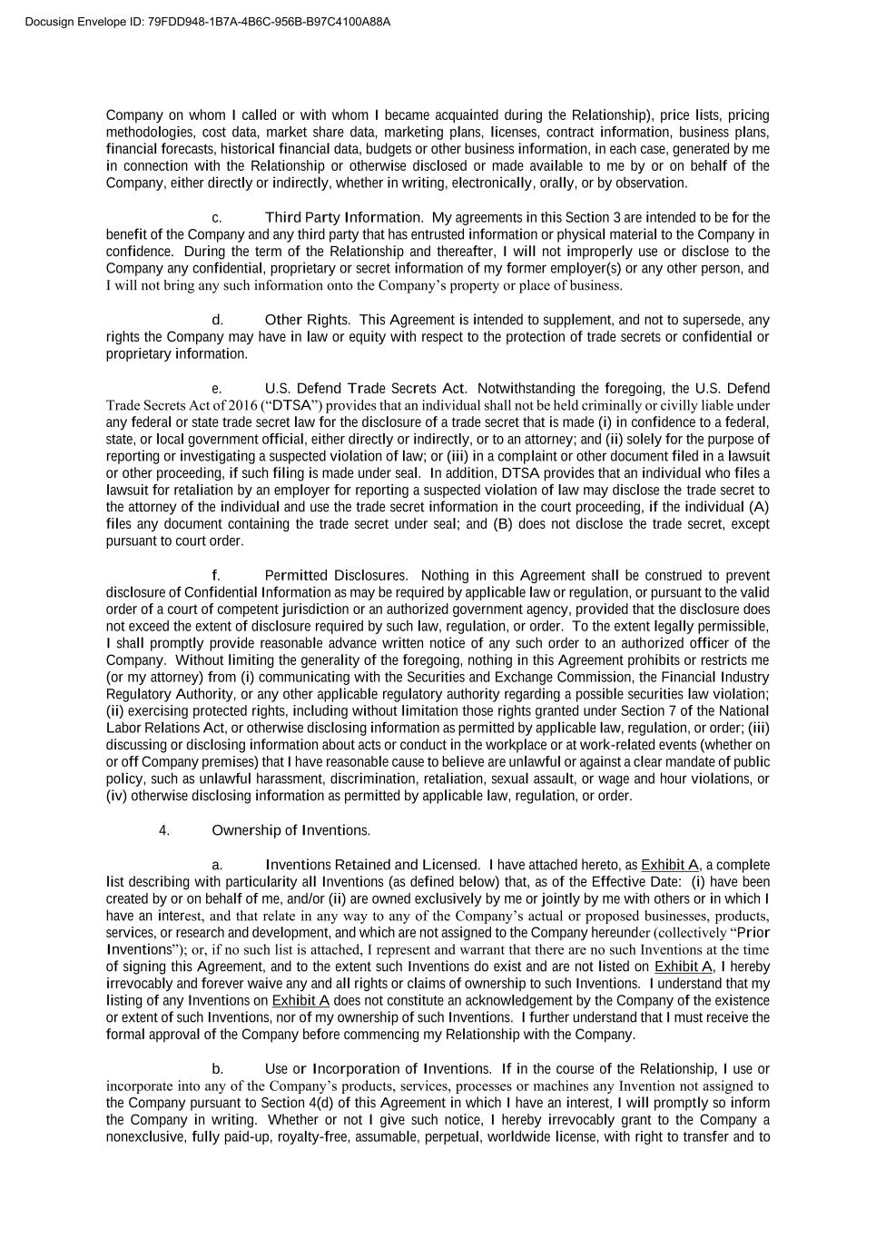 Company on whom I called or with whom I became acquainted during the Relationship), price lists, pricing methodologies, cost data, market share data, marketing plans, licenses, contract information, business plans, financial forecasts, historical financial data, budgets or other business information, in each case, generated by me in connection with the Relationship or otherwise disclosed or made available to me by or on behalf of the Company, either directly or indirectly, whether in writing, electronically, orally, or by observation. c. Third Party Information. My agreements in this Section 3 are intended to be for the benefit of the Company and any third party that has entrusted information or physical material to the Company in confidence. During the term of the Relationship and thereafter, I will not improperly use or disclose to the Company any confidential, proprietary or secret information of my former employer(s) or any other person, and I will not bring any such information onto the Company’s property or place of business. d. Other Rights. This Agreement is intended to supplement, and not to supersede, any rights the Company may have in law or equity with respect to the protection of trade secrets or confidential or proprietary information. e. U.S. Defend Trade Secrets Act. Notwithstanding the foregoing, the U.S. Defend Trade Secrets Act of 2016 (“DTSA”) provides that an individual shall not be held criminally or civilly liable under any federal or state trade secret law for the disclosure of a trade secret that is made (i) in confidence to a federal, state, or local government official, either directly or indirectly, or to an attorney; and (ii) solely for the purpose of reporting or investigating a suspected violation of law; or (iii) in a complaint or other document filed in a lawsuit or other proceeding, if such filing is made under seal. In addition, DTSA provides that an individual who files a lawsuit for retaliation by an employer for reporting a suspected violation of law may disclose the trade secret to the attorney of the individual and use the trade secret information in the court proceeding, if the individual (A) files any document containing the trade secret under seal; and (B) does not disclose the trade secret, except pursuant to court order. f. Permitted Disclosures. Nothing in this Agreement shall be construed to prevent disclosure of Confidential Information as may be required by applicable law or regulation, or pursuant to the valid order of a court of competent jurisdiction or an authorized government agency, provided that the disclosure does not exceed the extent of disclosure required by such law, regulation, or order. To the extent legally permissible, I shall promptly provide reasonable advance written notice of any such order to an authorized officer of the Company. Without limiting the generality of the foregoing, nothing in this Agreement prohibits or restricts me (or my attorney) from (i) communicating with the Securities and Exchange Commission, the Financial Industry Regulatory Authority, or any other applicable regulatory authority regarding a possible securities law violation; (ii) exercising protected rights, including without limitation those rights granted under Section 7 of the National Labor Relations Act, or otherwise disclosing information as permitted by applicable law, regulation, or order; (iii) discussing or disclosing information about acts or conduct in the workplace or at work-related events (whether on or off Company premises) that I have reasonable cause to believe are unlawful or against a clear mandate of public policy, such as unlawful harassment, discrimination, retaliation, sexual assault, or wage and hour violations, or (iv) otherwise disclosing information as permitted by applicable law, regulation, or order. 4. Ownership of Inventions. a. Inventions Retained and Licensed. I have attached hereto, as Exhibit A, a complete list describing with particularity all Inventions (as defined below) that, as of the Effective Date: (i) have been created by or on behalf of me, and/or (ii) are owned exclusively by me or jointly by me with others or in which I have an interest, and that relate in any way to any of the Company’s actual or proposed businesses, products, services, or research and development, and which are not assigned to the Company hereunder (collectively “Prior Inventions”); or, if no such list is attached, I represent and warrant that there are no such Inventions at the time of signing this Agreement, and to the extent such Inventions do exist and are not listed on Exhibit A, I hereby irrevocably and forever waive any and all rights or claims of ownership to such Inventions. I understand that my listing of any Inventions on Exhibit A does not constitute an acknowledgement by the Company of the existence or extent of such Inventions, nor of my ownership of such Inventions. I further understand that I must receive the formal approval of the Company before commencing my Relationship with the Company. b. Use or Incorporation of Inventions. If in the course of the Relationship, I use or incorporate into any of the Company’s products, services, processes or machines any Invention not assigned to the Company pursuant to Section 4(d) of this Agreement in which I have an interest, I will promptly so inform the Company in writing. Whether or not I give such notice, I hereby irrevocably grant to the Company a nonexclusive, fully paid-up, royalty-free, assumable, perpetual, worldwide license, with right to transfer and to Docusign Envelope ID: 79FDD948-1B7A-4B6C-956B-B97C4100A88A