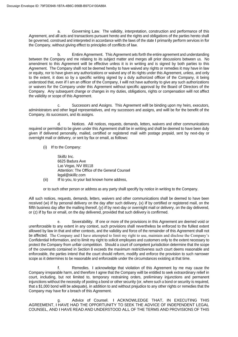 a. Governing Law. The validity, interpretation, construction and performance of this Agreement, and all acts and transactions pursuant hereto and the rights and obligations of the parties hereto shall be governed, construed and interpreted in accordance with the laws of the state I primarily perform services in for the Company, without giving effect to principles of conflicts of law. b. Entire Agreement. This Agreement sets forth the entire agreement and understanding between the Company and me relating to its subject matter and merges all prior discussions between us. No amendment to this Agreement will be effective unless it is in writing and is signed by both parties to this Agreement. The Company shall not be deemed hereby to have waived any rights or remedies it may have in law or equity, nor to have given any authorizations or waived any of its rights under this Agreement, unless, and only to the extent, it does so by a specific writing signed by a duly authorized officer of the Company, it being understood that, even if I am an officer of the Company, I will not have authority to give any such authorizations or waivers for the Company under this Agreement without specific approval by the Board of Directors of the Company. Any subsequent change or changes in my duties, obligations, rights or compensation will not affect the validity or scope of this Agreement. c. Successors and Assigns. This Agreement will be binding upon my heirs, executors, administrators and other legal representatives, and my successors and assigns, and will be for the benefit of the Company, its successors, and its assigns. d. Notices. All notices, requests, demands, letters, waivers and other communications required or permitted to be given under this Agreement shall be in writing and shall be deemed to have been duly given if delivered personally, mailed, certified or registered mail with postage prepaid, sent by next-day or overnight mail or delivery, or sent by fax or email, as follows: (i) If to the Company: Skillz Inc. 6625 Badura Ave Las Vegas, NV 89118 Attention: The Office of the General Counsel legal@skillz.com (ii) If to you, to your last known home address, or to such other person or address as any party shall specify by notice in writing to the Company. All such notices, requests, demands, letters, waivers and other communications shall be deemed to have been received (w) if by personal delivery on the day after such delivery, (x) if by certified or registered mail, on the fifth business day after the mailing thereof, (y) if by next-day or overnight mail or delivery, on the day delivered, or (z) if by fax or email, on the day delivered, provided that such delivery is confirmed. e. Severability. If one or more of the provisions in this Agreement are deemed void or unenforceable to any extent in any context, such provisions shall nevertheless be enforced to the fullest extent allowed by law in that and other contexts, and the validity and force of the remainder of this Agreement shall not be affected. The Company and I have attempted to limit my right to use, maintain and disclose the Company’s Confidential Information, and to limit my right to solicit employees and customers only to the extent necessary to protect the Company from unfair competition. Should a court of competent jurisdiction determine that the scope of the covenants contained in Section 8 exceeds the maximum restrictiveness such court deems reasonable and enforceable, the parties intend that the court should reform, modify and enforce the provision to such narrower scope as it determines to be reasonable and enforceable under the circumstances existing at that time. f. Remedies. I acknowledge that violation of this Agreement by me may cause the Company irreparable harm, and therefore I agree that the Company will be entitled to seek extraordinary relief in court, including, but not limited to, temporary restraining orders, preliminary injunctions and permanent injunctions without the necessity of posting a bond or other security (or, where such a bond or security is required, that a $1,000 bond will be adequate), in addition to and without prejudice to any other rights or remedies that the Company may have for a breach of this Agreement. g. Advice of Counsel. I ACKNOWLEDGE THAT, IN EXECUTING THIS AGREEMENT, I HAVE HAD THE OPPORTUNITY TO SEEK THE ADVICE OF INDEPENDENT LEGAL COUNSEL, AND I HAVE READ AND UNDERSTOOD ALL OF THE TERMS AND PROVISIONS OF THIS Docusign Envelope ID: 79FDD948-1B7A-4B6C-956B-B97C4100A88A