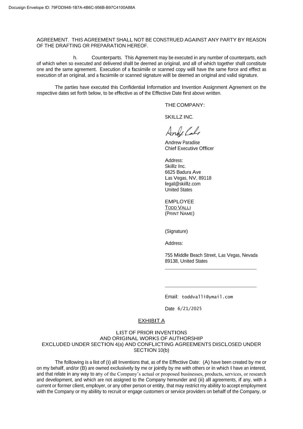 AGREEMENT. THIS AGREEMENT SHALL NOT BE CONSTRUED AGAINST ANY PARTY BY REASON OF THE DRAFTING OR PREPARATION HEREOF. h. Counterparts. This Agreement may be executed in any number of counterparts, each of which when so executed and delivered shall be deemed an original, and all of which together shall constitute one and the same agreement. Execution of a facsimile or scanned copy will have the same force and effect as execution of an original, and a facsimile or scanned signature will be deemed an original and valid signature. The parties have executed this Confidential Information and Invention Assignment Agreement on the respective dates set forth below, to be effective as of the Effective Date first above written. THE COMPANY: SKILLZ INC. Andrew Paradise Chief Executive Officer Address: Skillz Inc. 6625 Badura Ave Las Vegas, NV, 89118 legal@skillz.com United States EMPLOYEE TODD VALLI (PRINT NAME) [IXJZ7JD_____________________] (Signature) Address: 755 Middle Beach Street, Las Vegas, Nevada 89138, United States Email: [3q5450e_____________________] Date [d7empgd_________] EXHIBIT A LIST OF PRIOR INVENTIONS AND ORIGINAL WORKS OF AUTHORSHIP EXCLUDED UNDER SECTION 4(a) AND CONFLICTING AGREEMENTS DISCLOSED UNDER SECTION 10(b) The following is a list of (i) all Inventions that, as of the Effective Date: (A) have been created by me or on my behalf, and/or (B) are owned exclusively by me or jointly by me with others or in which I have an interest, and that relate in any way to any of the Company’s actual or proposed businesses, products, services, or research and development, and which are not assigned to the Company hereunder and (ii) all agreements, if any, with a current or former client, employer, or any other person or entity, that may restrict my ability to accept employment with the Company or my ability to recruit or engage customers or service providers on behalf of the Company, or Docusign Envelope ID: 79FDD948-1B7A-4B6C-956B-B97C4100A88A toddvalli@ymail.com 6/21/2025