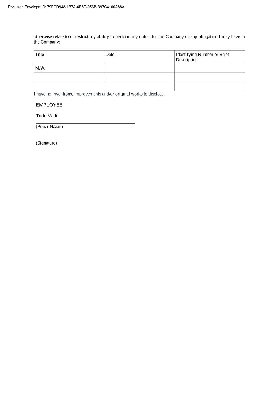otherwise relate to or restrict my ability to perform my duties for the Company or any obligation I may have to the Company: Title Date Identifying Number or Brief Description N/A I have no inventions, improvements and/or original works to disclose. EMPLOYEE Todd Valli (PRINT NAME) [9L57MTJ_____________________] (Signature) Docusign Envelope ID: 79FDD948-1B7A-4B6C-956B-B97C4100A88A