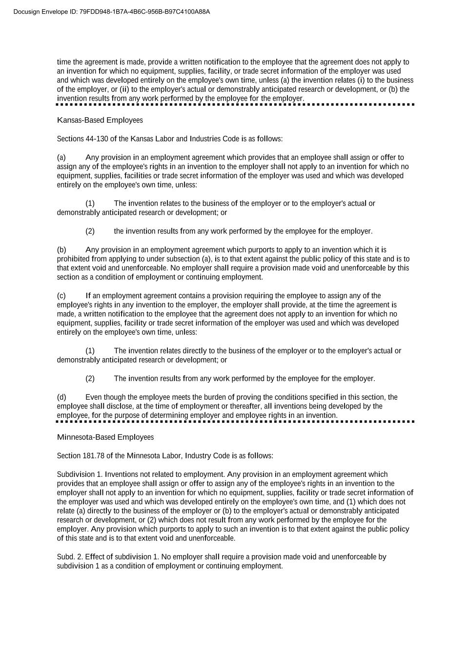 time the agreement is made, provide a written notification to the employee that the agreement does not apply to an invention for which no equipment, supplies, facility, or trade secret information of the employer was used and which was developed entirely on the employee's own time, unless (a) the invention relates (i) to the business of the employer, or (ii) to the employer's actual or demonstrably anticipated research or development, or (b) the invention results from any work performed by the employee for the employer. Kansas-Based Employees Sections 44-130 of the Kansas Labor and Industries Code is as follows: (a) Any provision in an employment agreement which provides that an employee shall assign or offer to assign any of the employee's rights in an invention to the employer shall not apply to an invention for which no equipment, supplies, facilities or trade secret information of the employer was used and which was developed entirely on the employee's own time, unless: (1) The invention relates to the business of the employer or to the employer's actual or demonstrably anticipated research or development; or (2) the invention results from any work performed by the employee for the employer. (b) Any provision in an employment agreement which purports to apply to an invention which it is prohibited from applying to under subsection (a), is to that extent against the public policy of this state and is to that extent void and unenforceable. No employer shall require a provision made void and unenforceable by this section as a condition of employment or continuing employment. (c) If an employment agreement contains a provision requiring the employee to assign any of the employee's rights in any invention to the employer, the employer shall provide, at the time the agreement is made, a written notification to the employee that the agreement does not apply to an invention for which no equipment, supplies, facility or trade secret information of the employer was used and which was developed entirely on the employee's own time, unless: (1) The invention relates directly to the business of the employer or to the employer's actual or demonstrably anticipated research or development; or (2) The invention results from any work performed by the employee for the employer. (d) Even though the employee meets the burden of proving the conditions specified in this section, the employee shall disclose, at the time of employment or thereafter, all inventions being developed by the employee, for the purpose of determining employer and employee rights in an invention. Minnesota-Based Employees Section 181.78 of the Minnesota Labor, Industry Code is as follows: Subdivision 1. Inventions not related to employment. Any provision in an employment agreement which provides that an employee shall assign or offer to assign any of the employee's rights in an invention to the employer shall not apply to an invention for which no equipment, supplies, facility or trade secret information of the employer was used and which was developed entirely on the employee's own time, and (1) which does not relate (a) directly to the business of the employer or (b) to the employer's actual or demonstrably anticipated research or development, or (2) which does not result from any work performed by the employee for the employer. Any provision which purports to apply to such an invention is to that extent against the public policy of this state and is to that extent void and unenforceable. Subd. 2. Effect of subdivision 1. No employer shall require a provision made void and unenforceable by subdivision 1 as a condition of employment or continuing employment. Docusign Envelope ID: 79FDD948-1B7A-4B6C-956B-B97C4100A88A